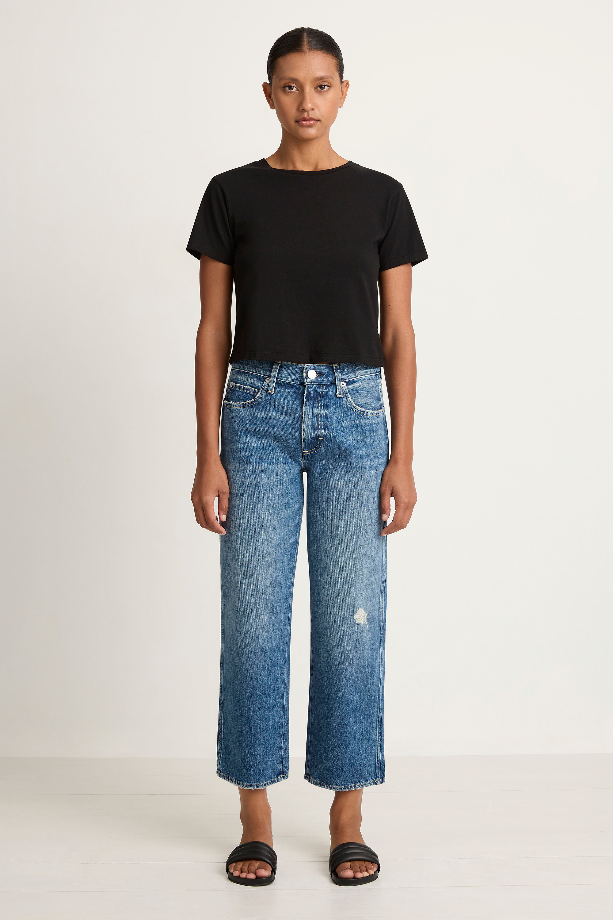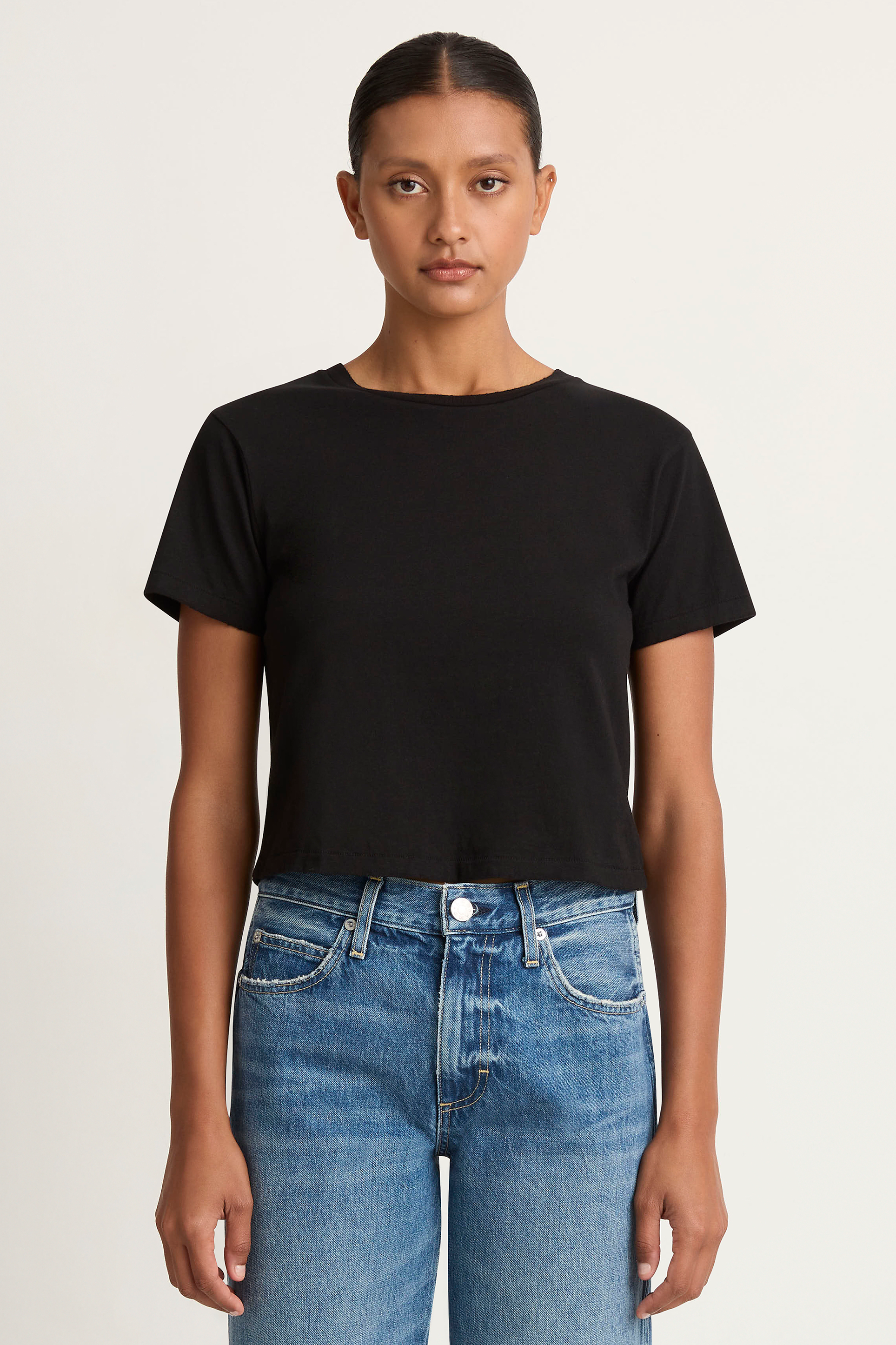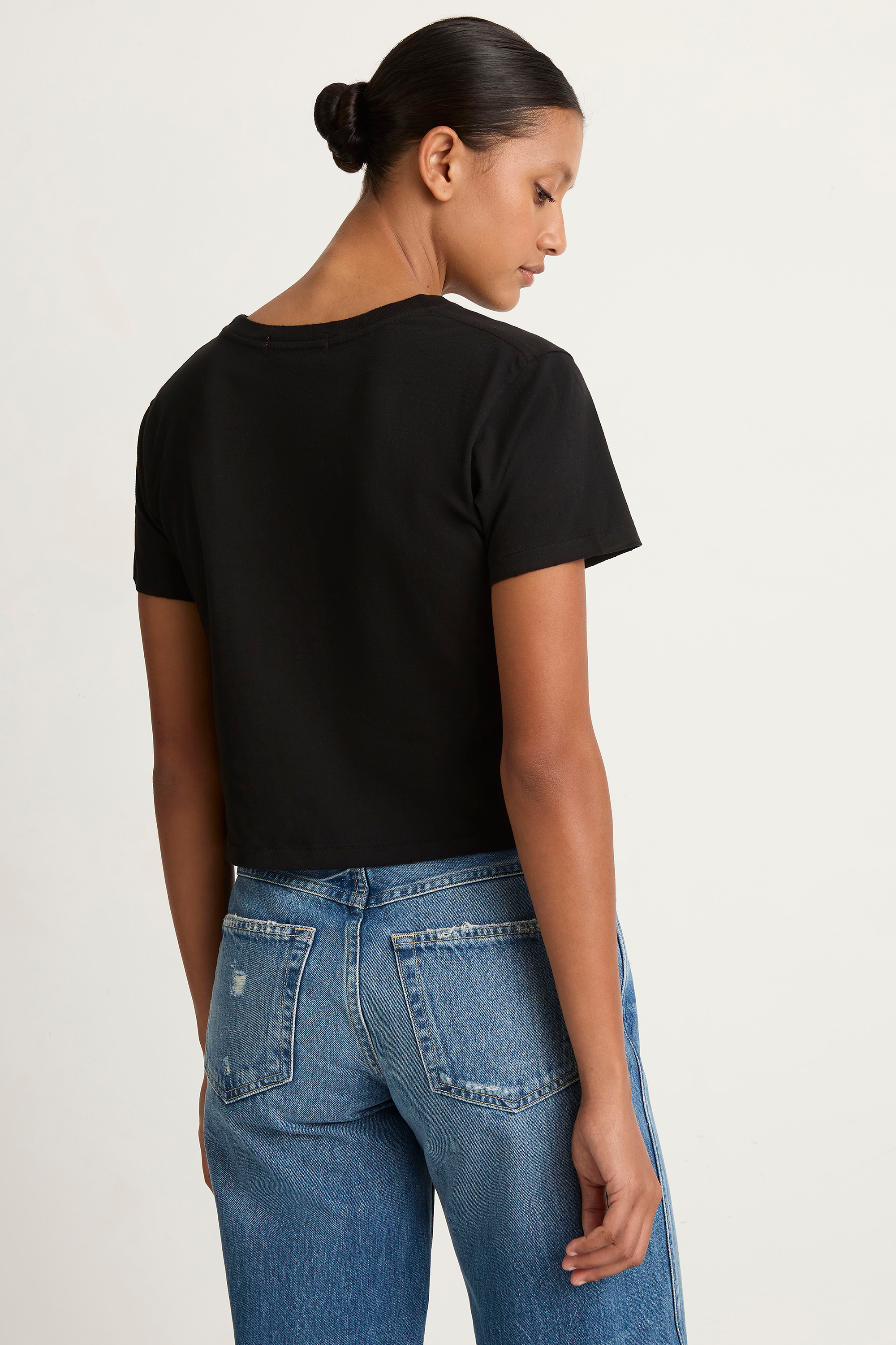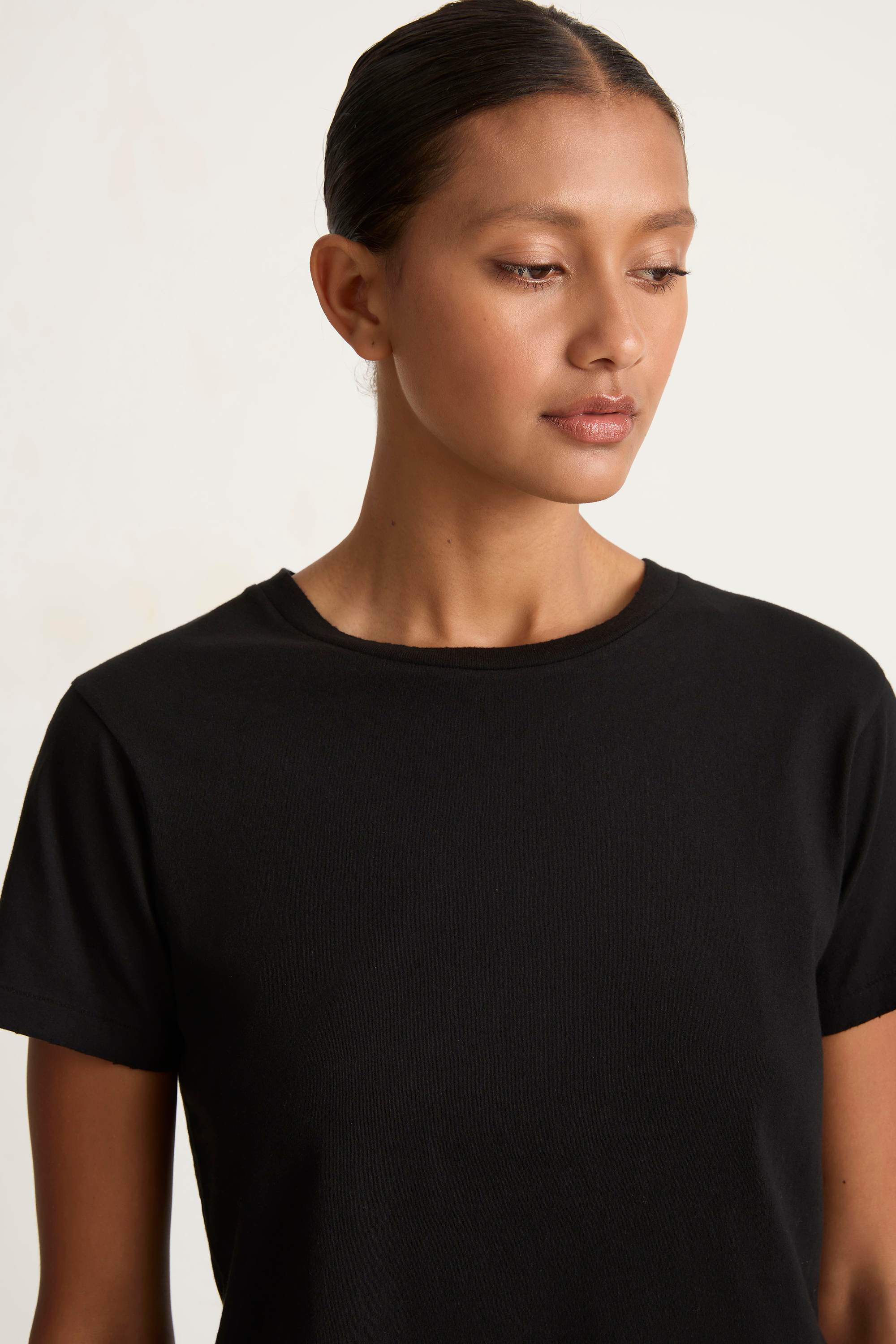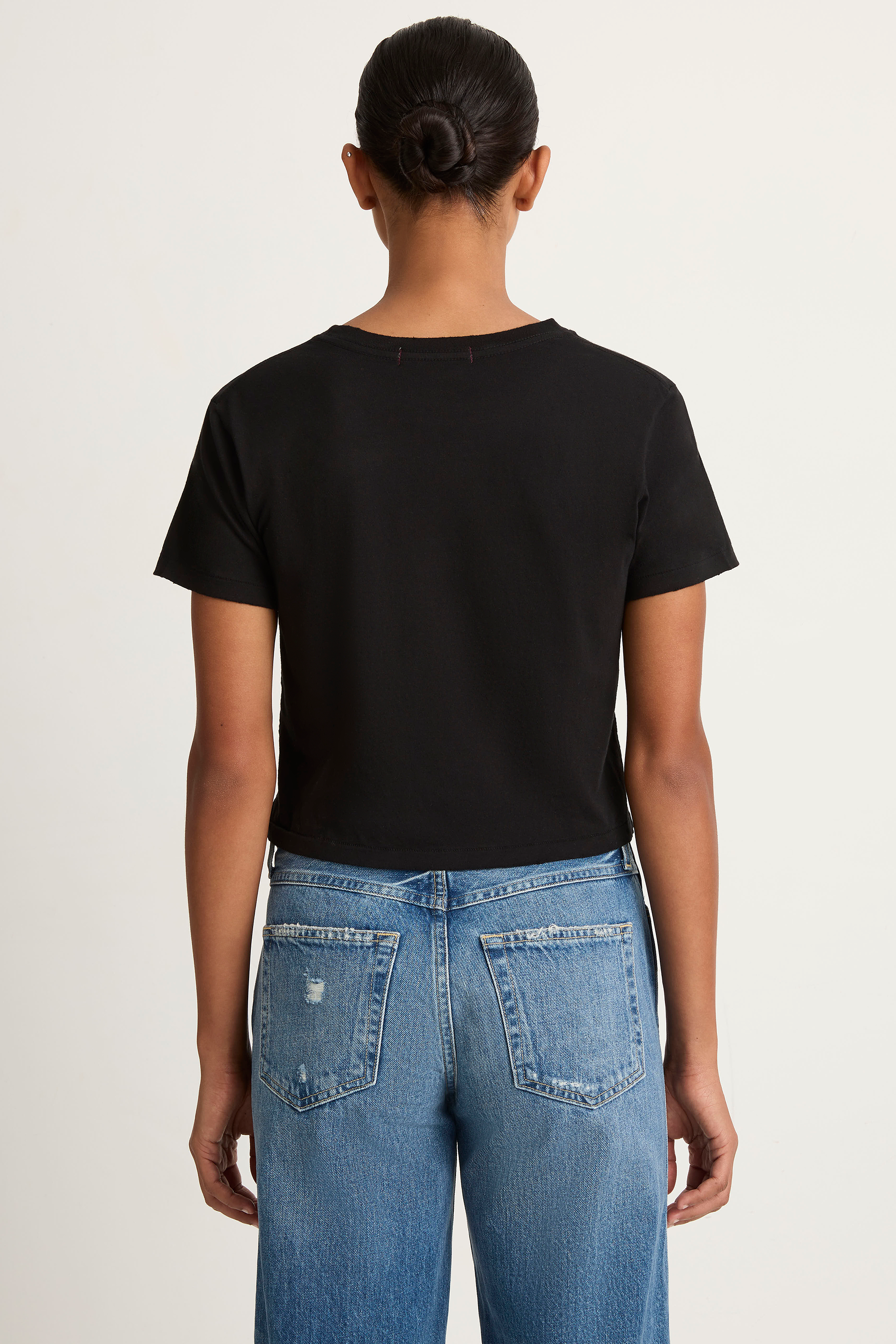 Classic cotton jersey tee with cropped boxy fit and short sleeves. Hand distressed edges at the neckline and sleeves. Pairs perfectly with high waist bottoms. Made in Los Angeles.