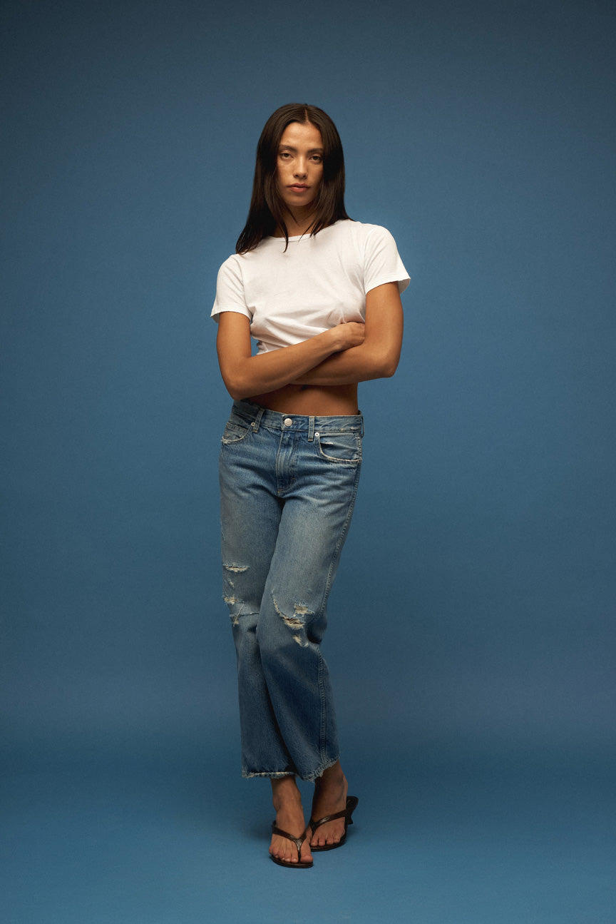 Cropped mid rise jean with wide straight leg for an easy fit. Designed to sit low on the hips for a relaxed look.
