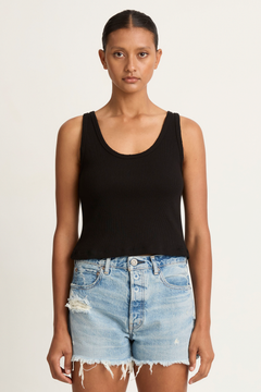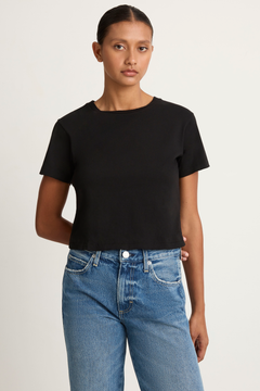 Classic cotton jersey tee with slightly boxy fit and short sleeves. Hand distressed edges at the neckline and sleeves. Made in Los Angeles.