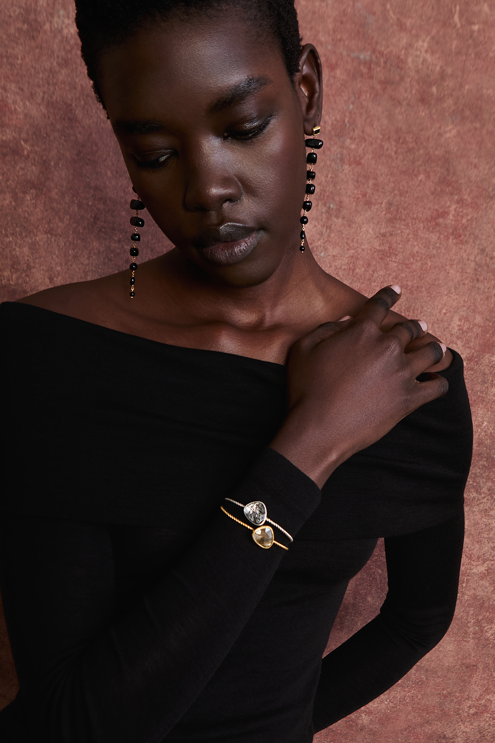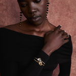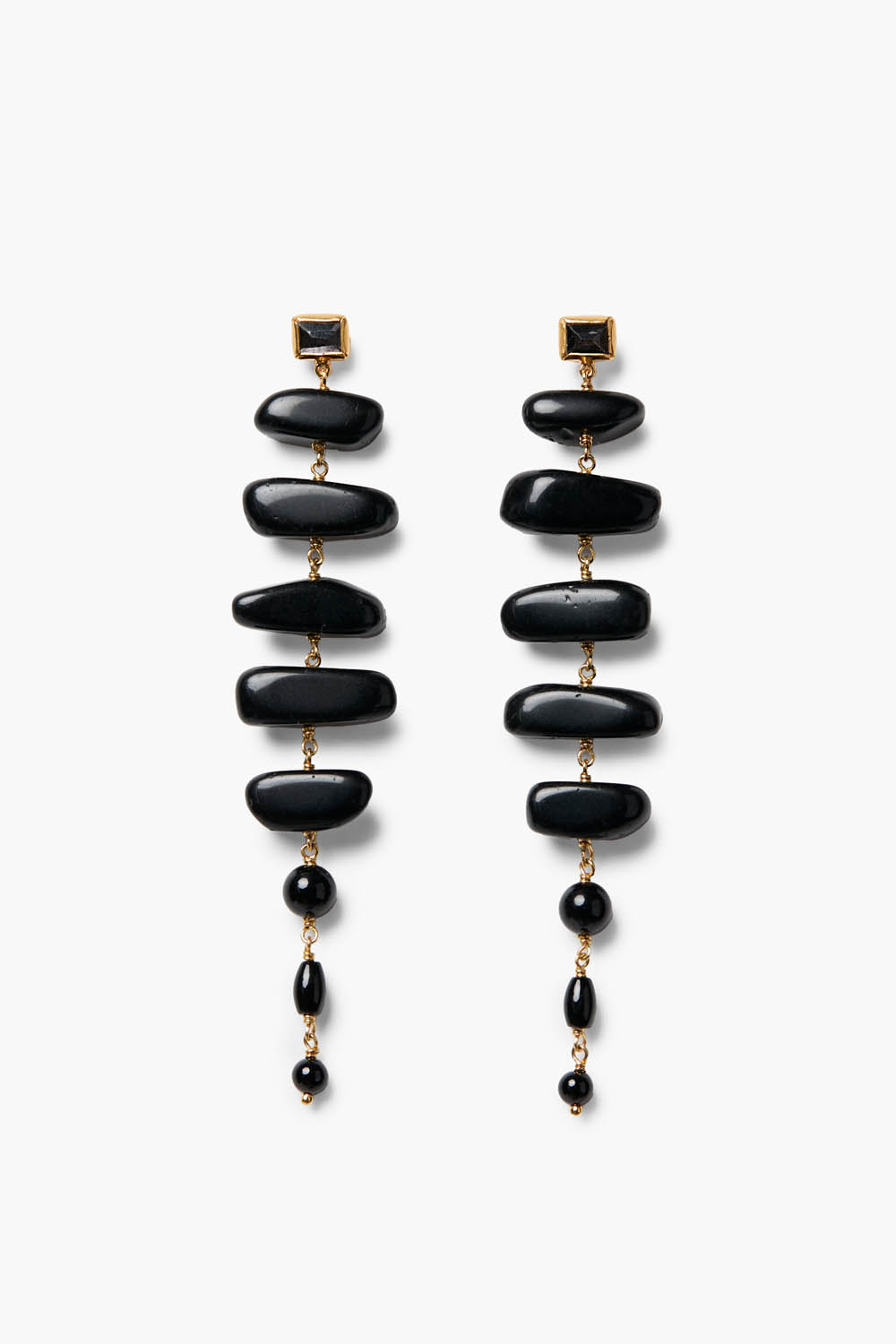 A cascade of black agate and hypersthene set in 18k gold-plated sterling silver — bold, fluid, and timeless.