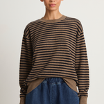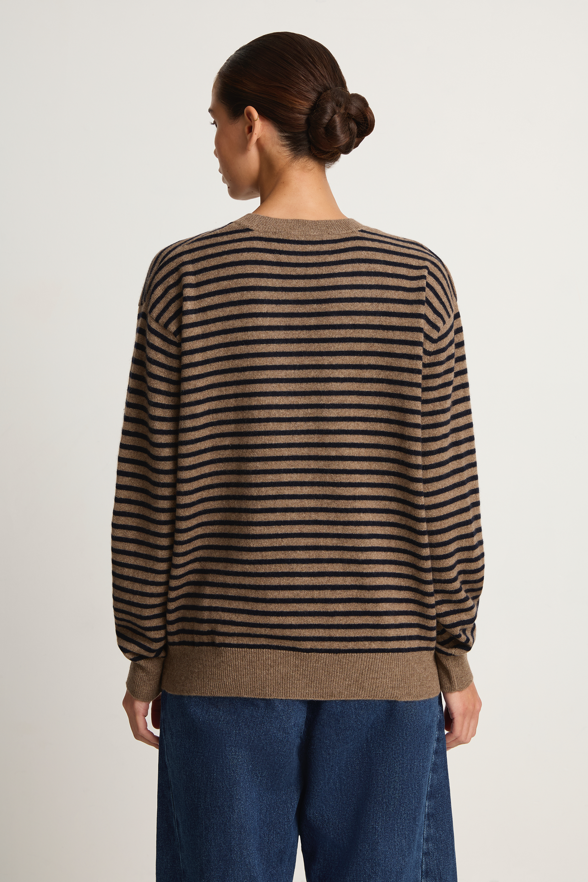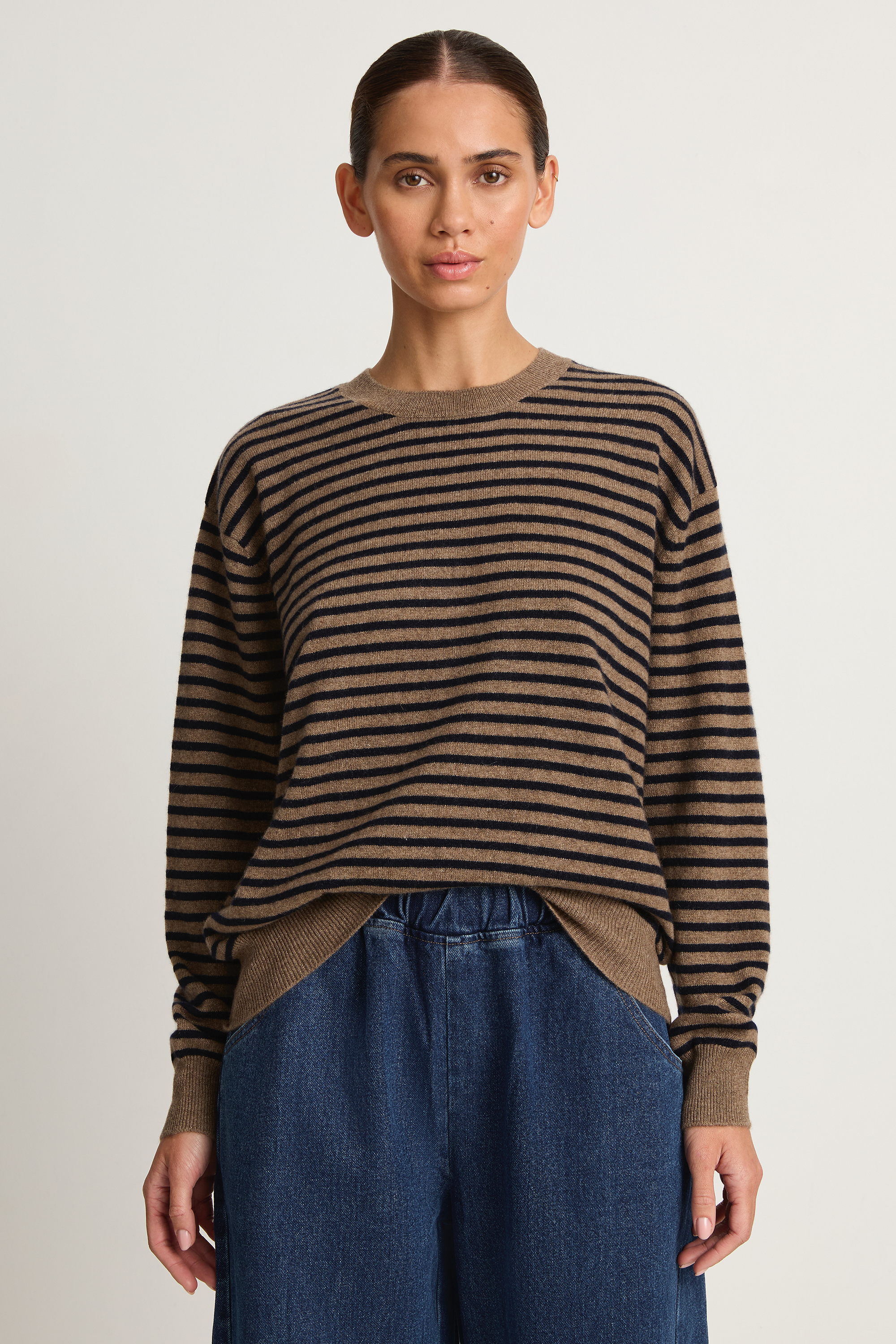 The Neve Sweater by Demylee, a relaxed ribbed crewneck in soft beige with navy stripes. Designed with slightly dropped shoulders and finished with rib trims throughout. Knit in pure cashmere the kind of piece you reach for again and again.