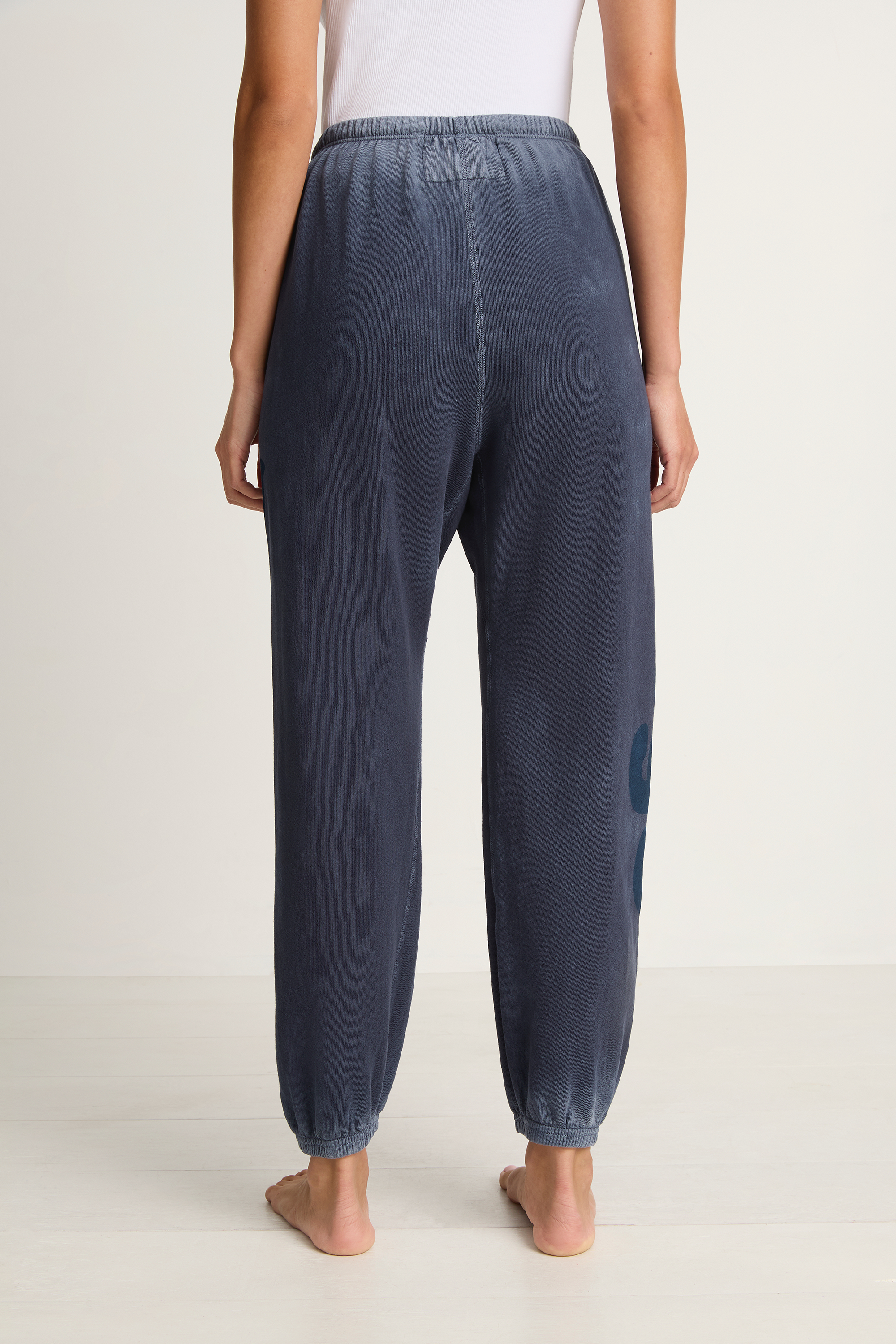 Unisex sweatpant washed to a lived-in fade with soft highs and lows. Deep blue FREECITY and tonal navy dove print against a sun-worn base, with deep blue LETSGO down the right leg. Easy elastic waist, drawstring tie, generous fit, soft comfort. Sewn, washed, and printed by hand in Los Angeles.