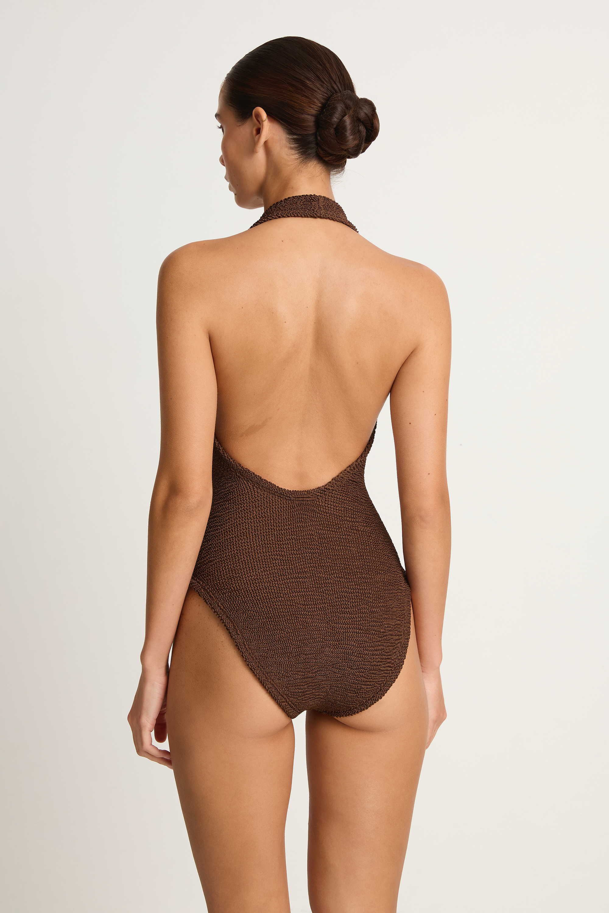 Meet Sandy, a new variation of Hunza G’s iconic Square Neck one piece, now shaped with a comfortable claspless halter that holds the straps gently and securely in place. A quiet nod to retro glamour, done in a way that feels effortless and modern.