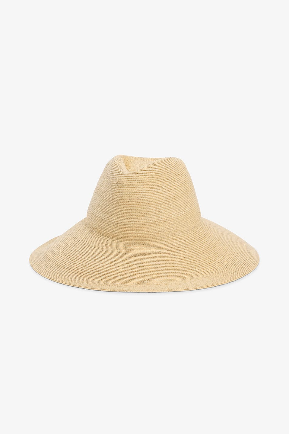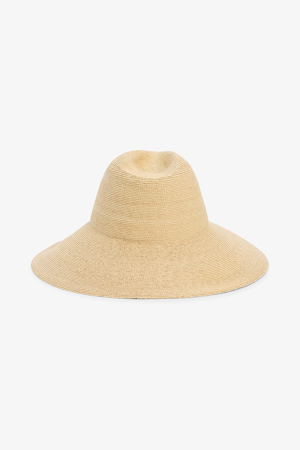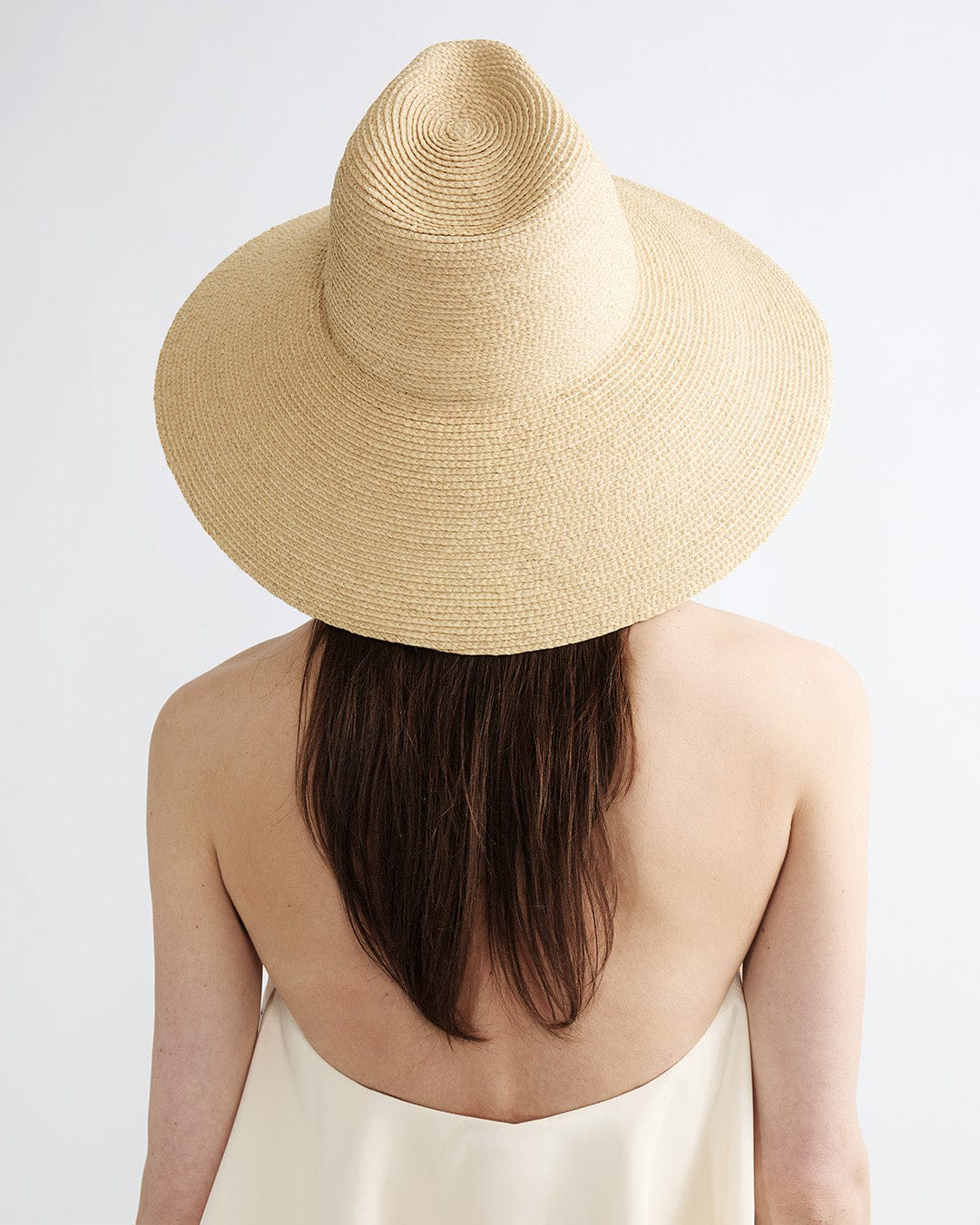 Handwoven raffia straw hat with a softly rounded crown and shorter, proportioned brim. A more compact take on the classic wide-brim silhouette with natural sun coverage.