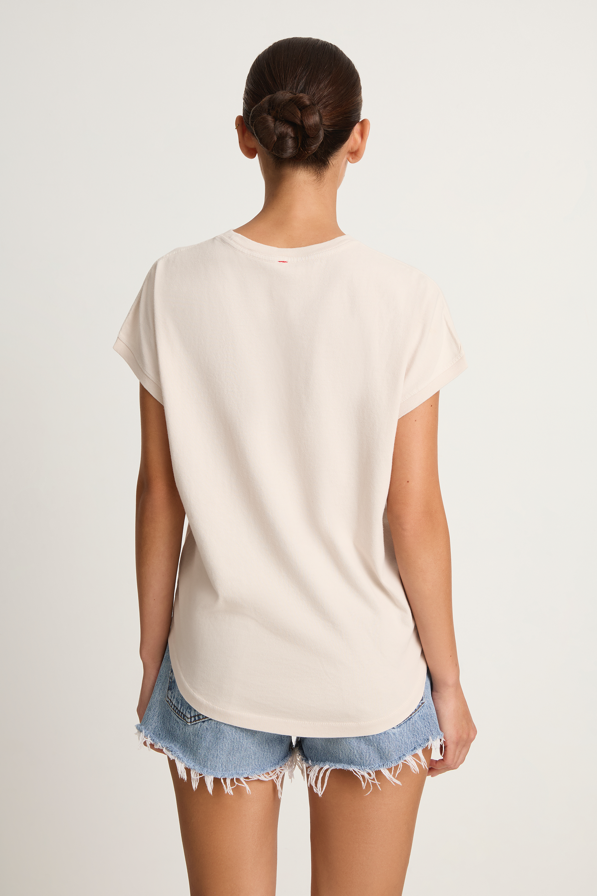 The Ease Tee is a refined dolman tee with an understated edge. A high crew neckline, soft shoulder coverage, and contrast ribbed trim give it structure, while the rounded hem and easy length work tucked or loose. Clean, modern, and made to wear on repeat.