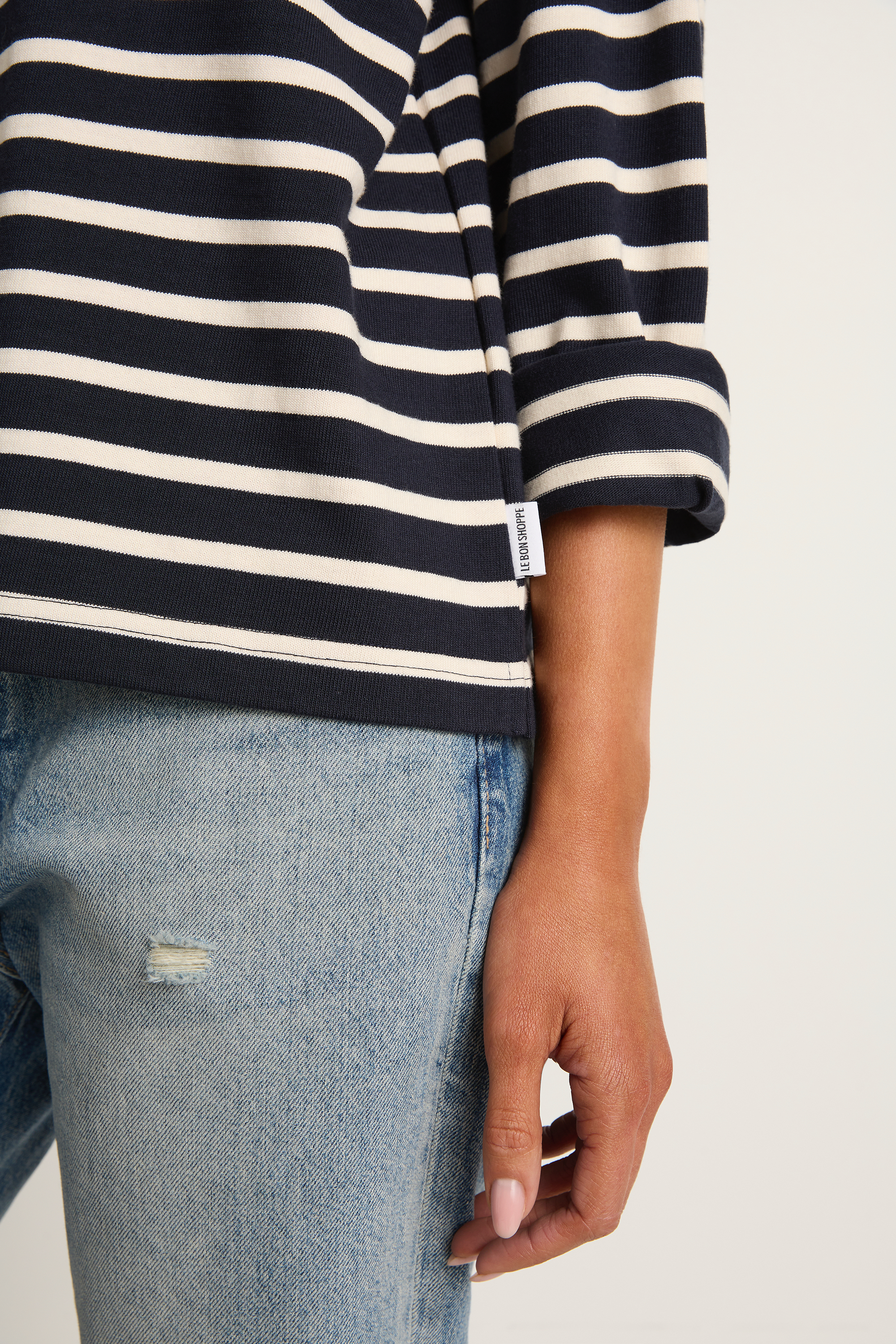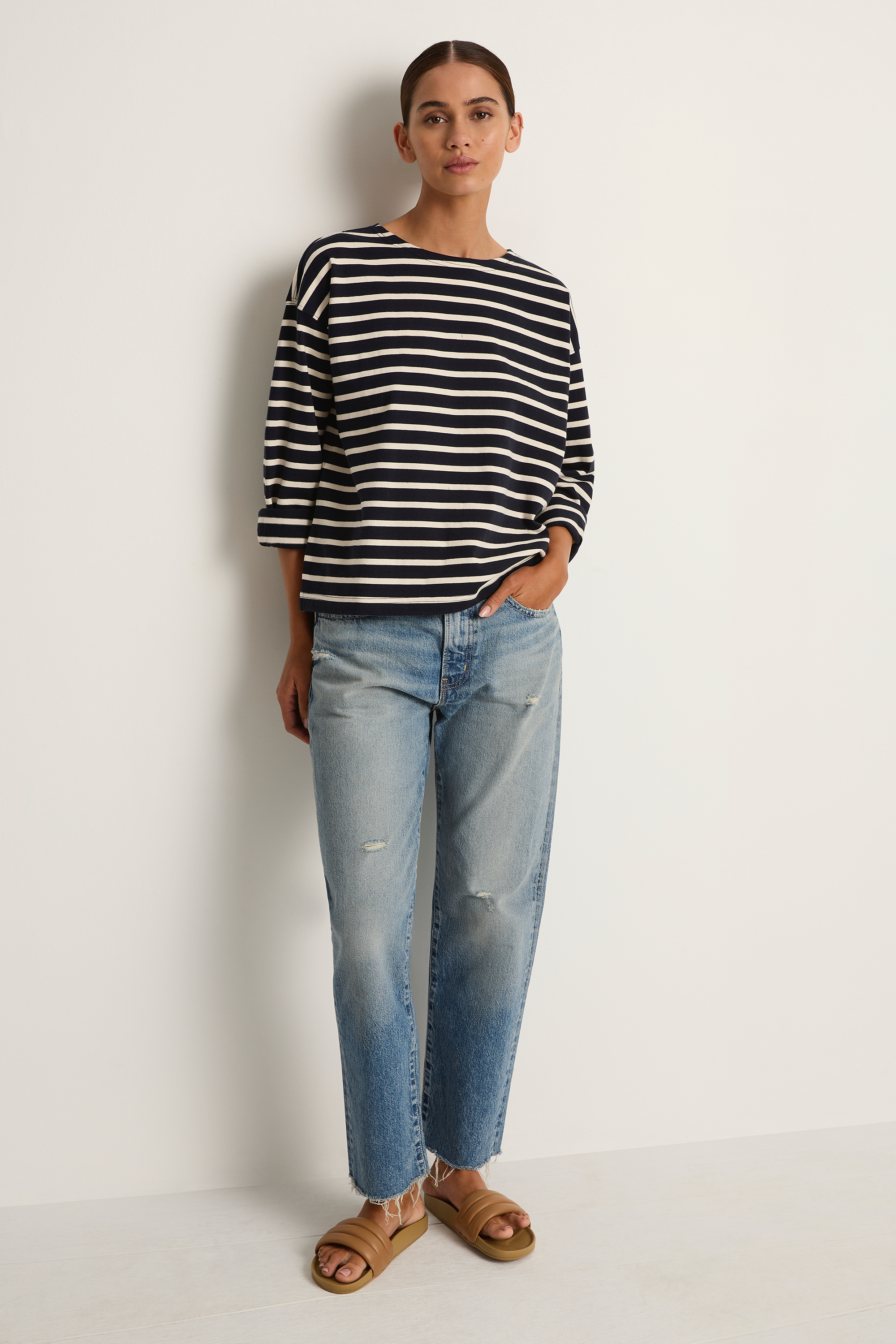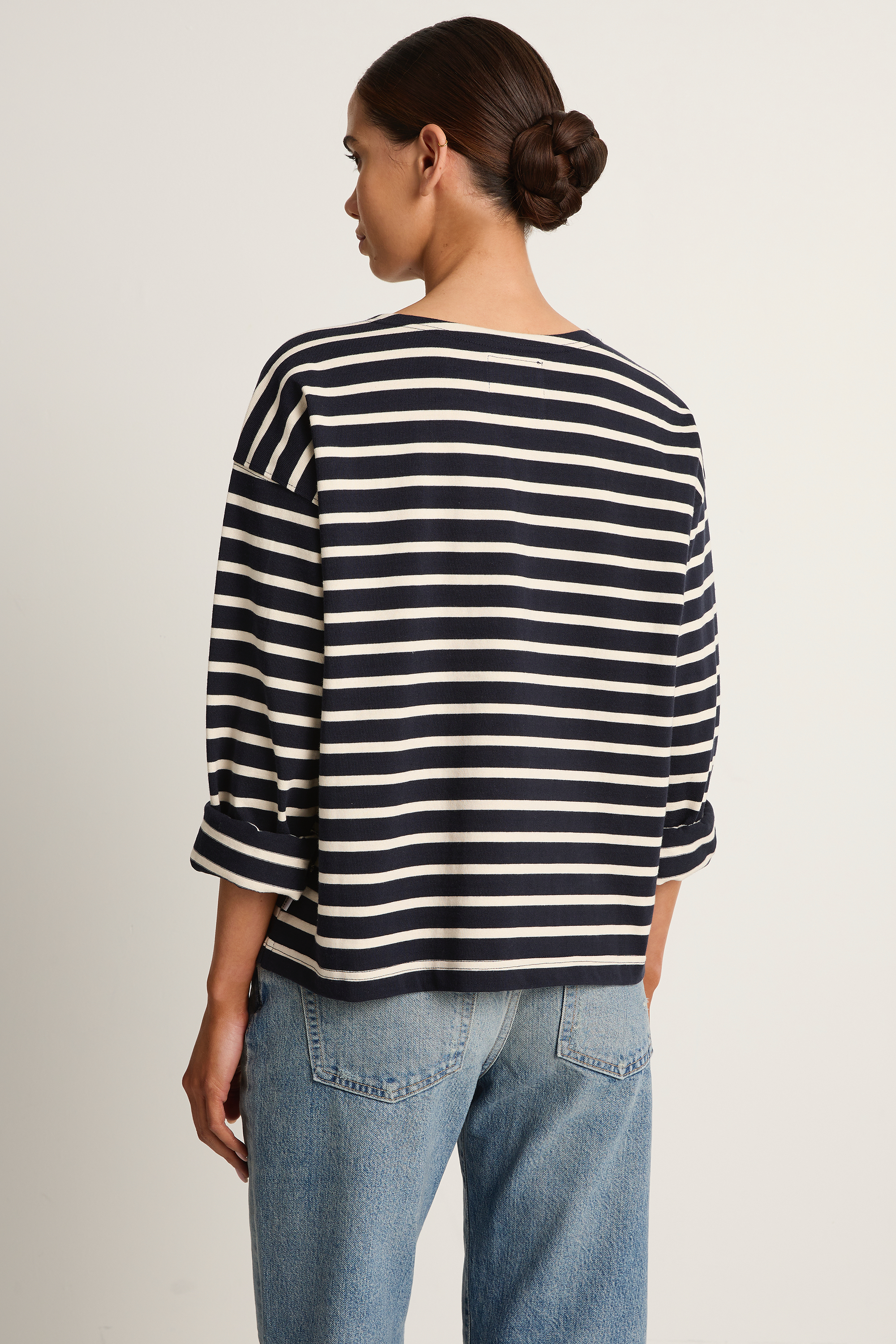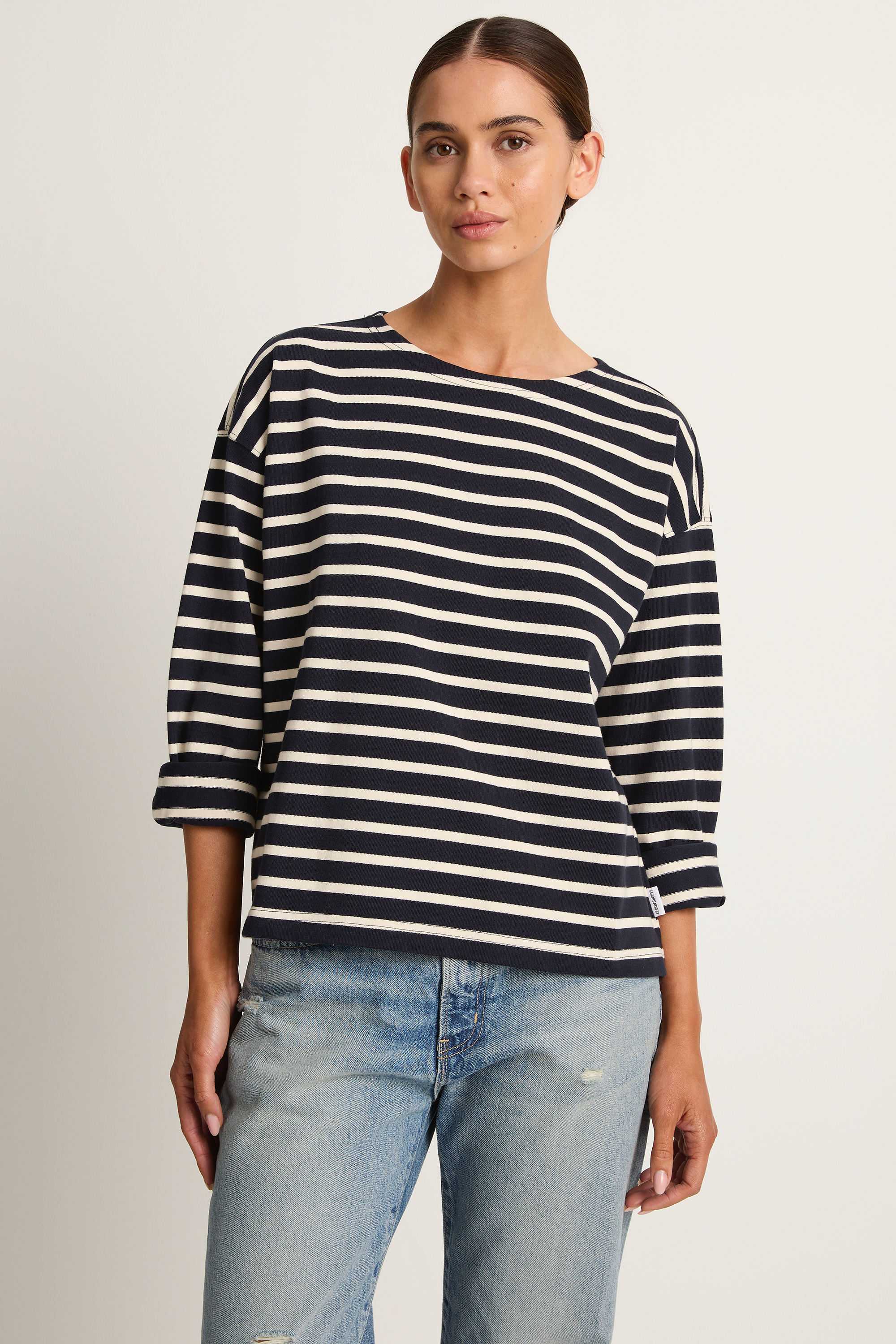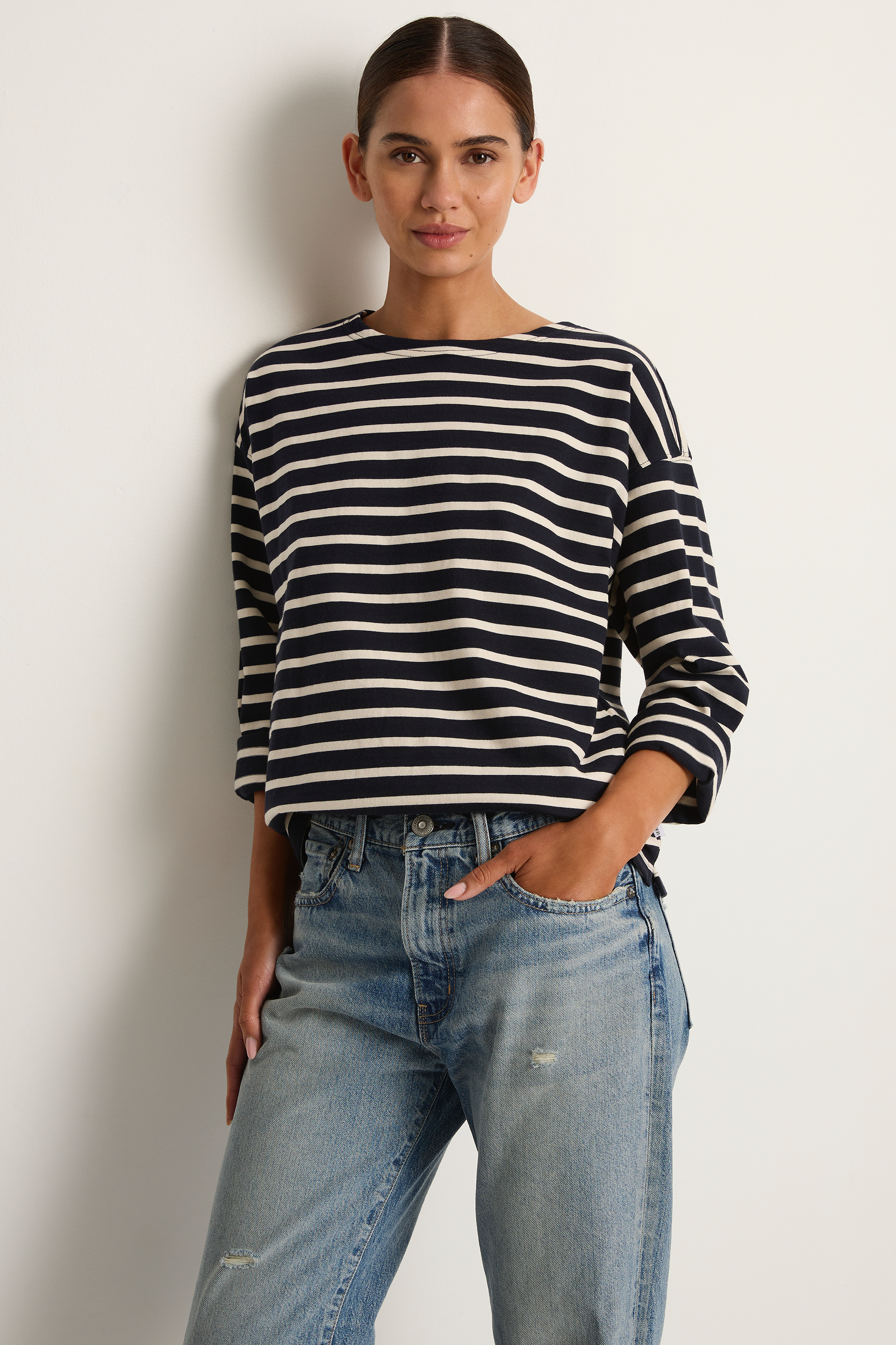 The Sailor Top by Le Bon Shoppe, a classic nautical long sleeve top with Breton stripes and a boxy fit, refined by a round neckline and a slightly cropped length that pairs effortlessly with high-waisted bottoms.