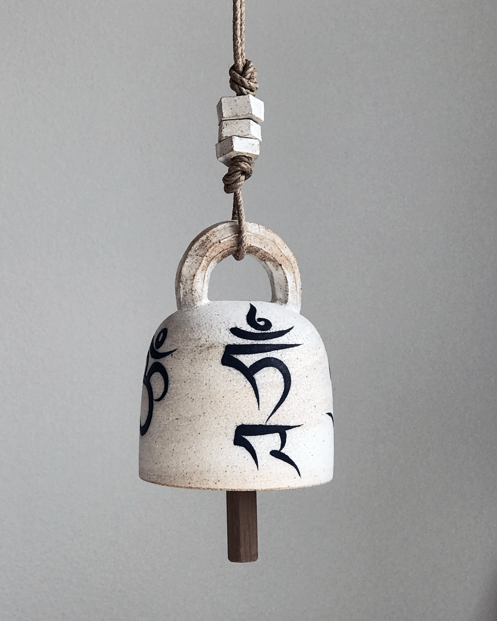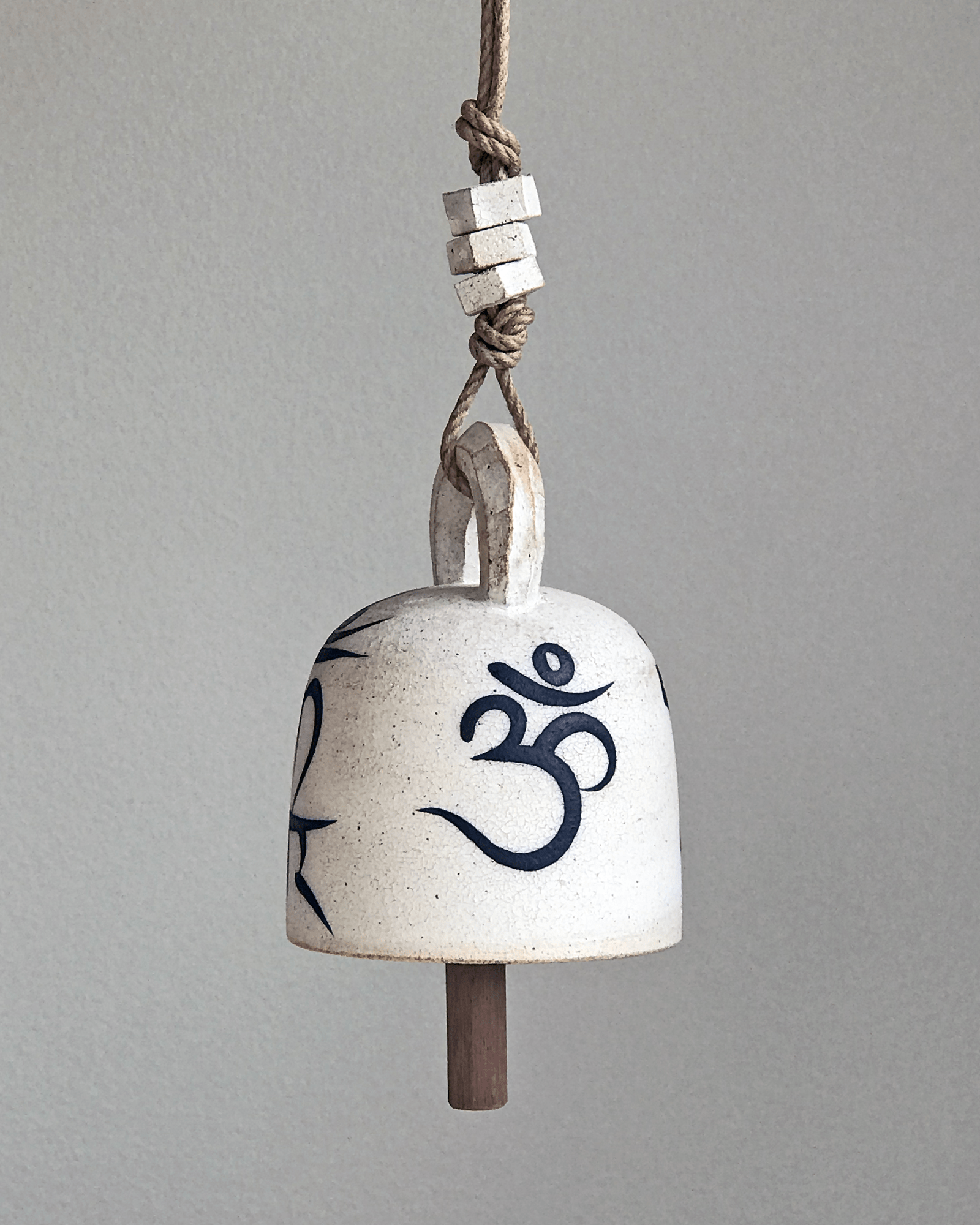The Tara Om round bell is hand thrown on the wheel, then hand-painted with indigo. The feminine counterpart of bodhisattva in Tibetan Buddhism, Tara embodies compassion, enlightenment and female strength.