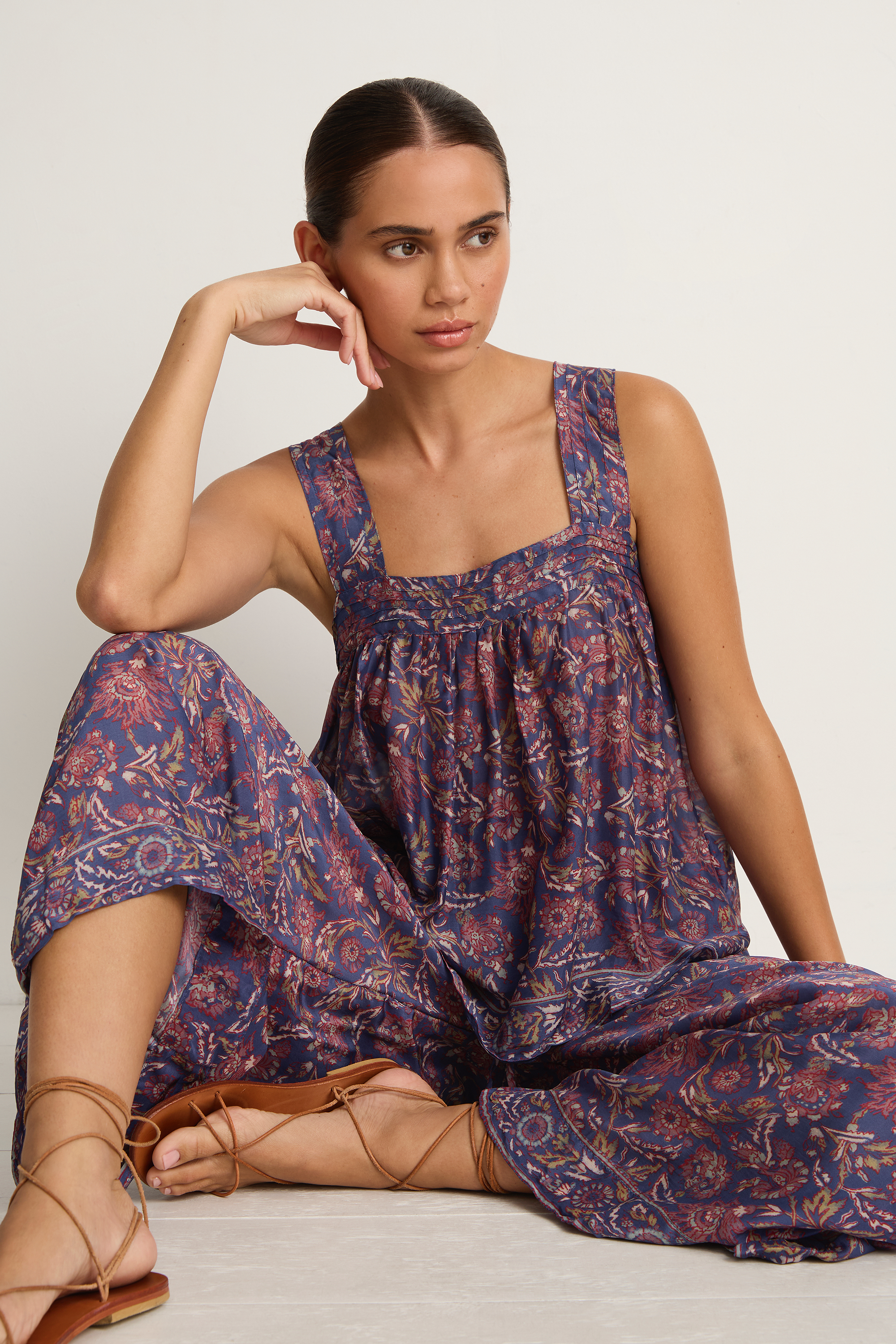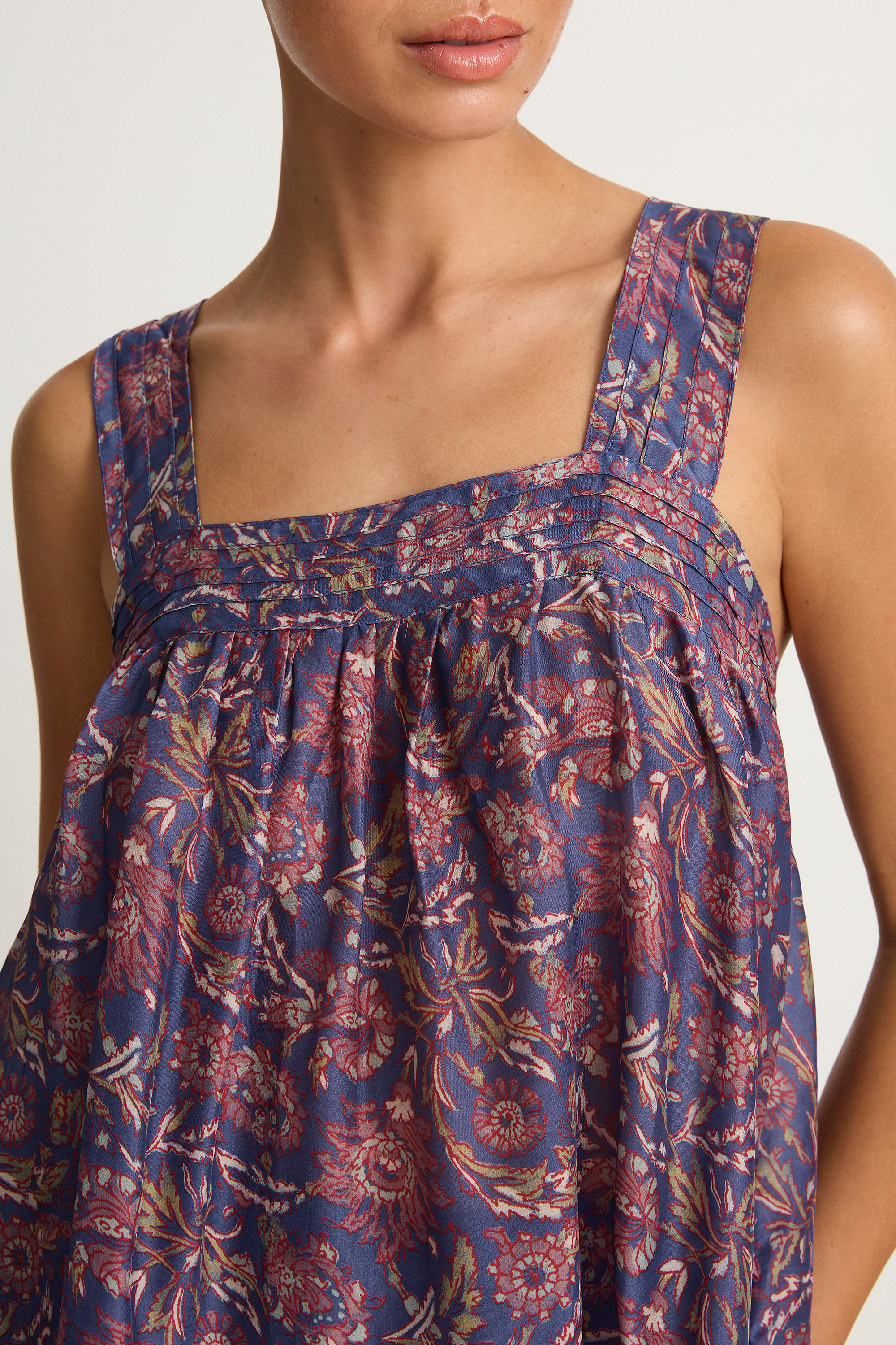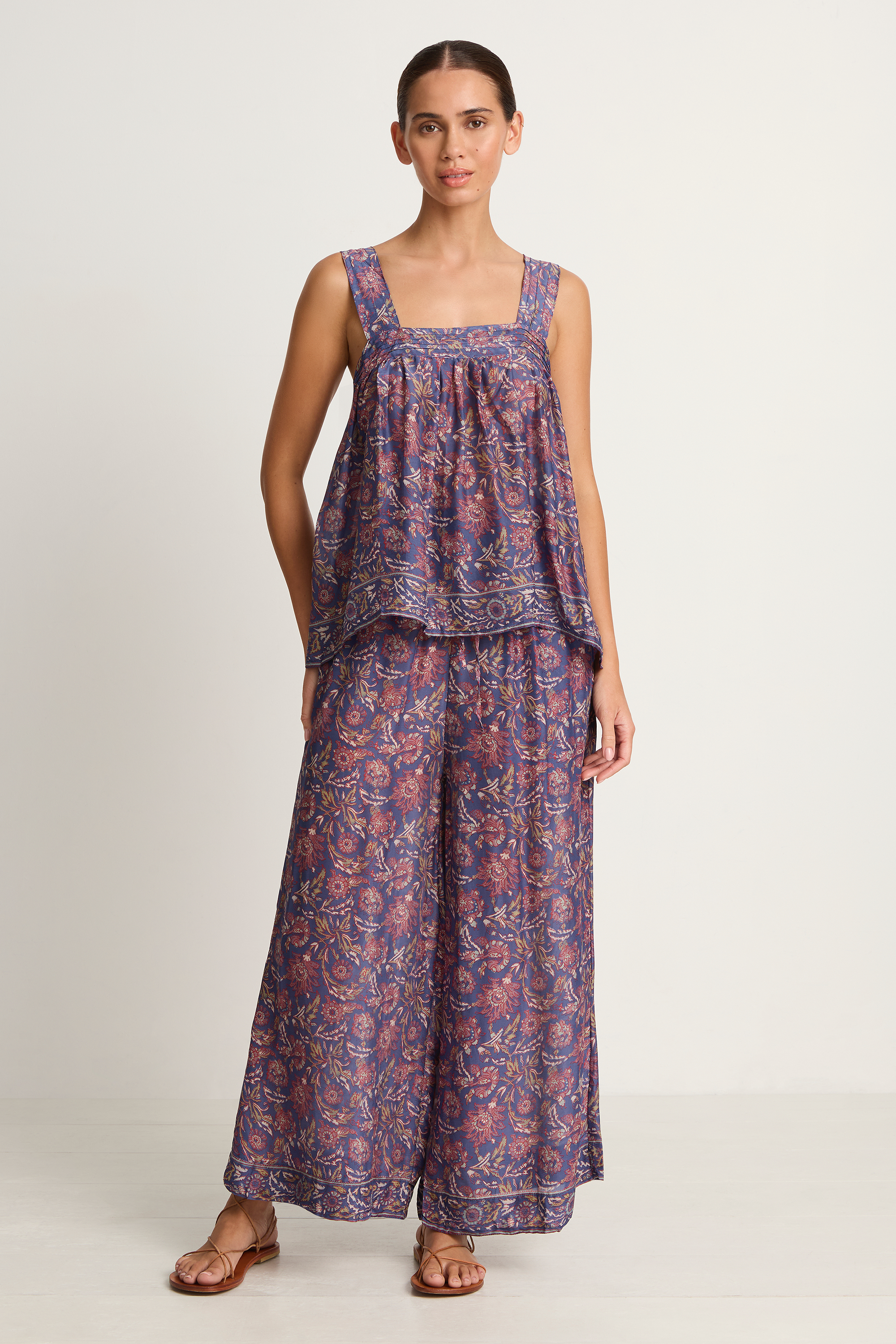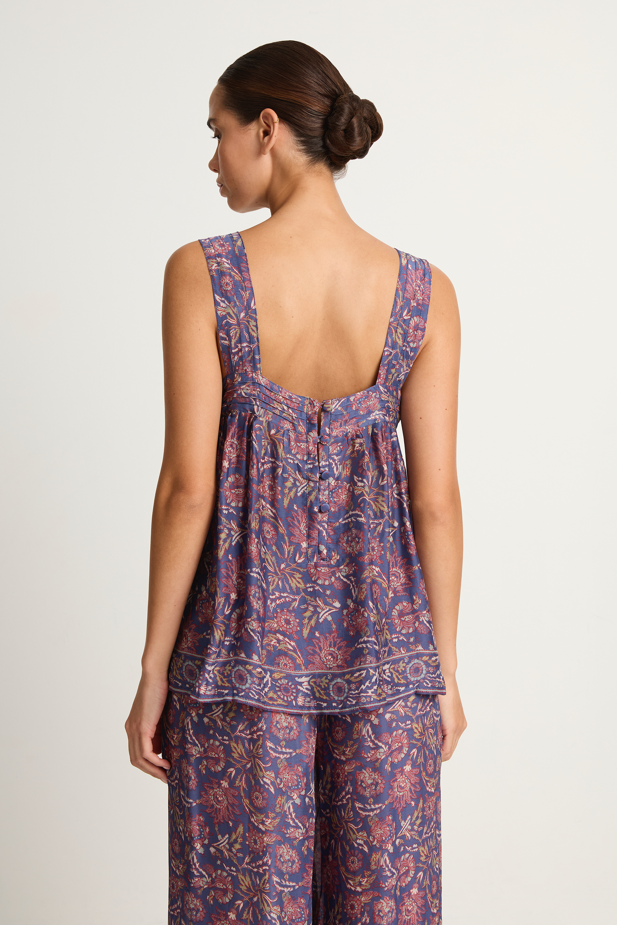 The perfect warm weather top to wear with denim or the matching Lauren pant shown on our model. The Jasmine features pintuck details, wide straps and button closure in back.