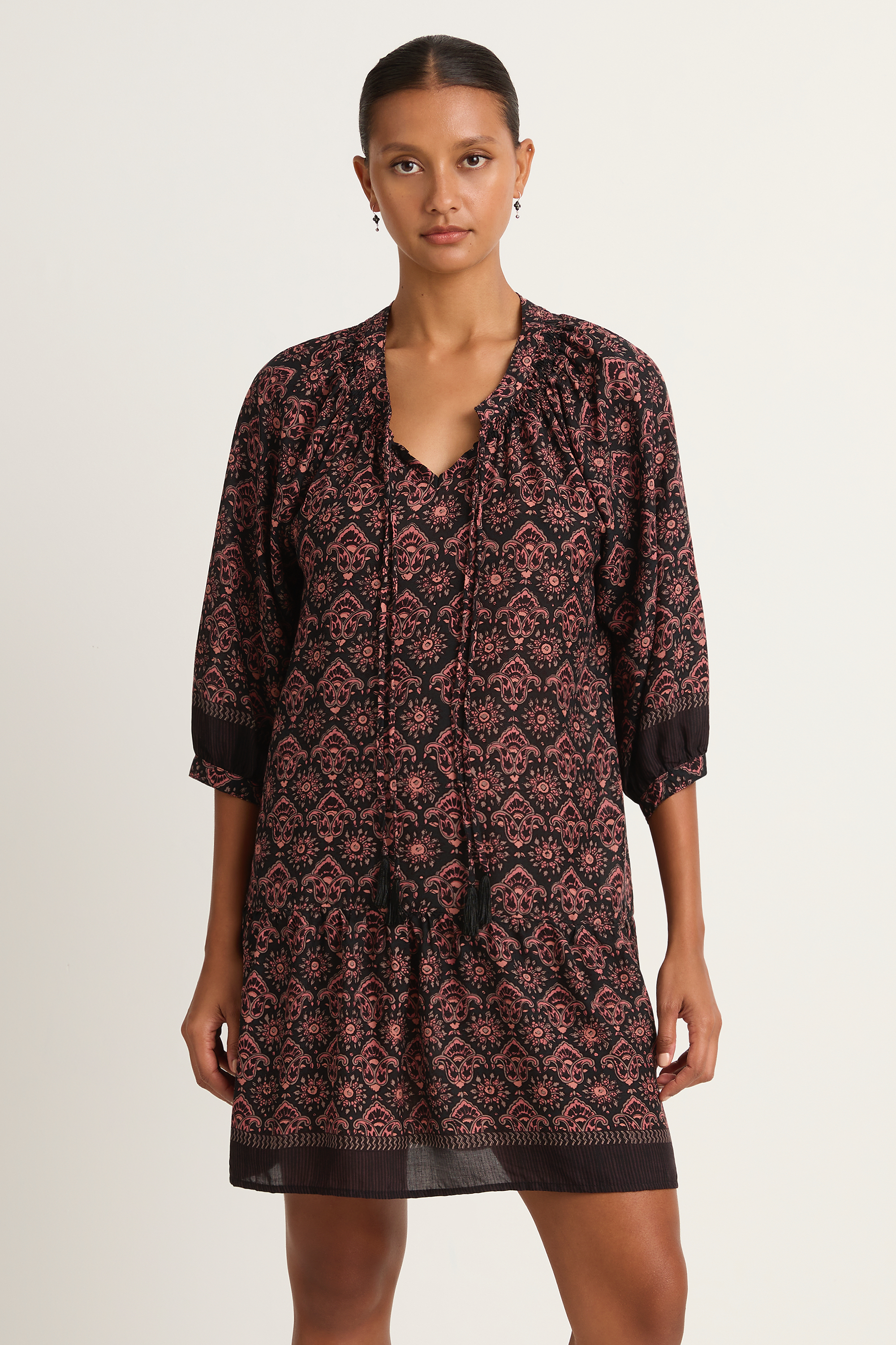 • split neckline with tassel tie closure