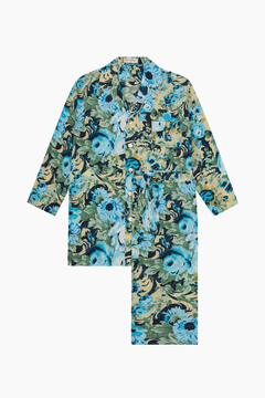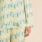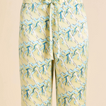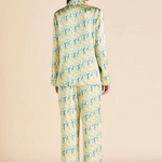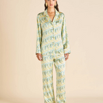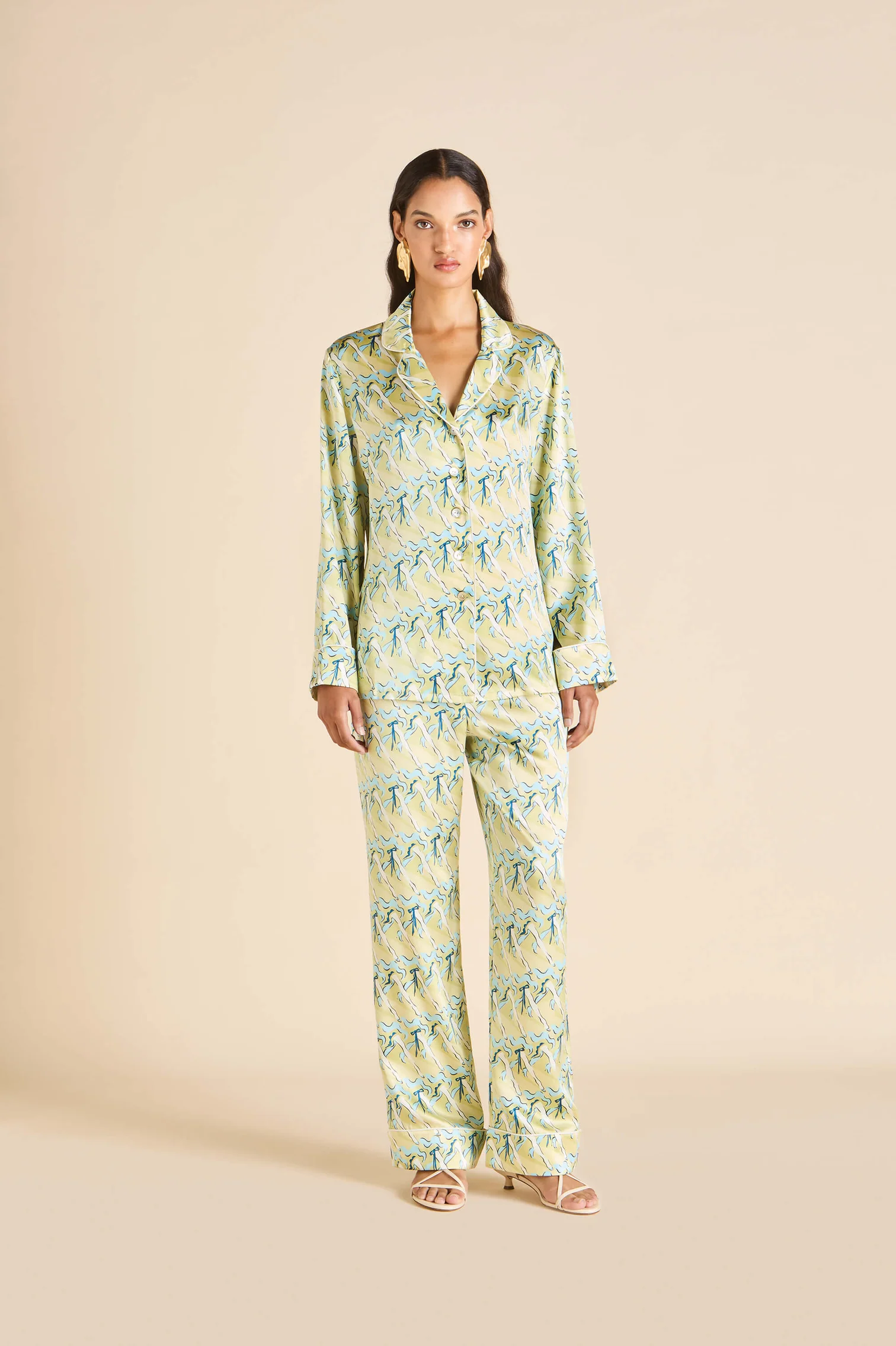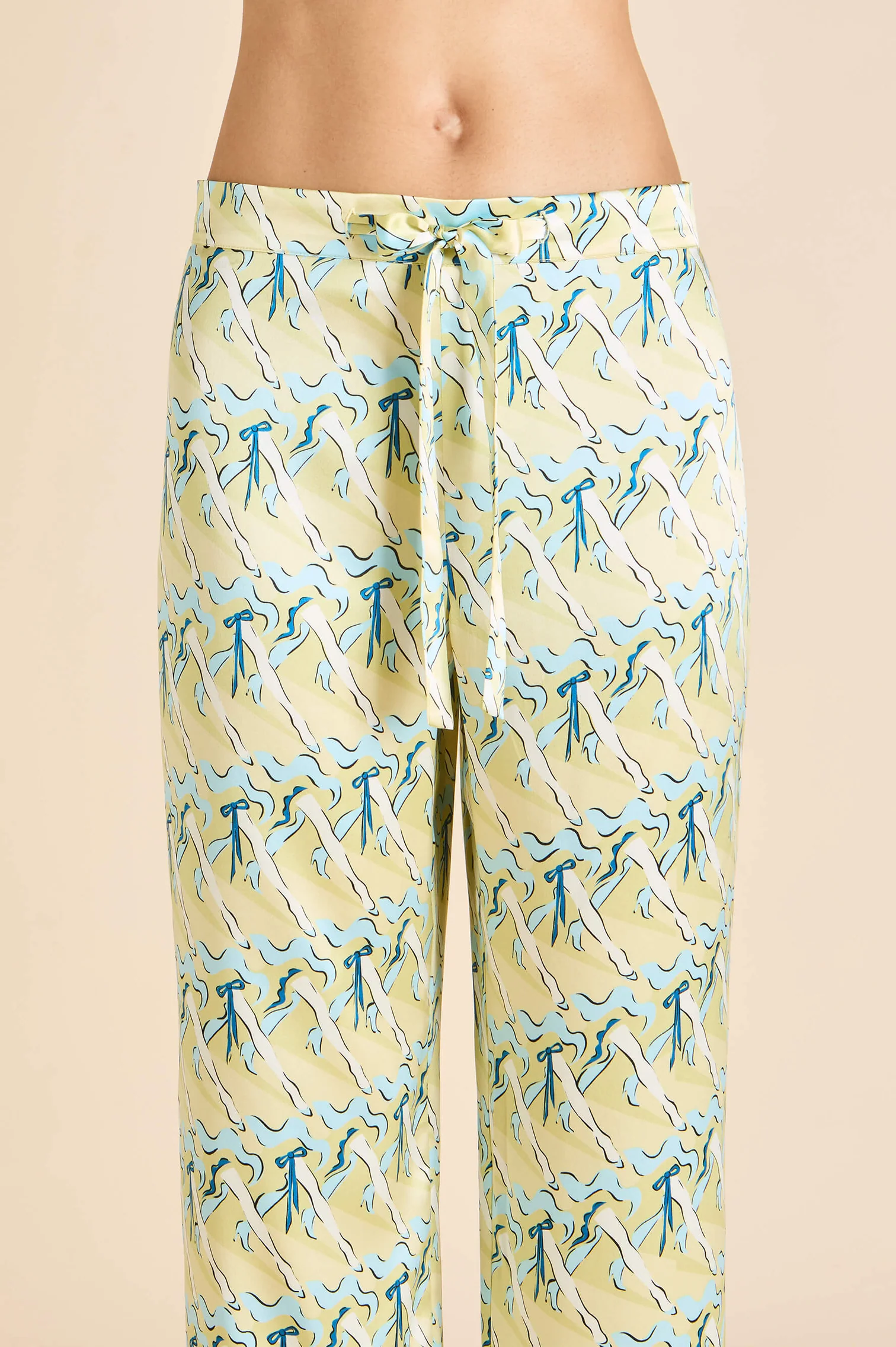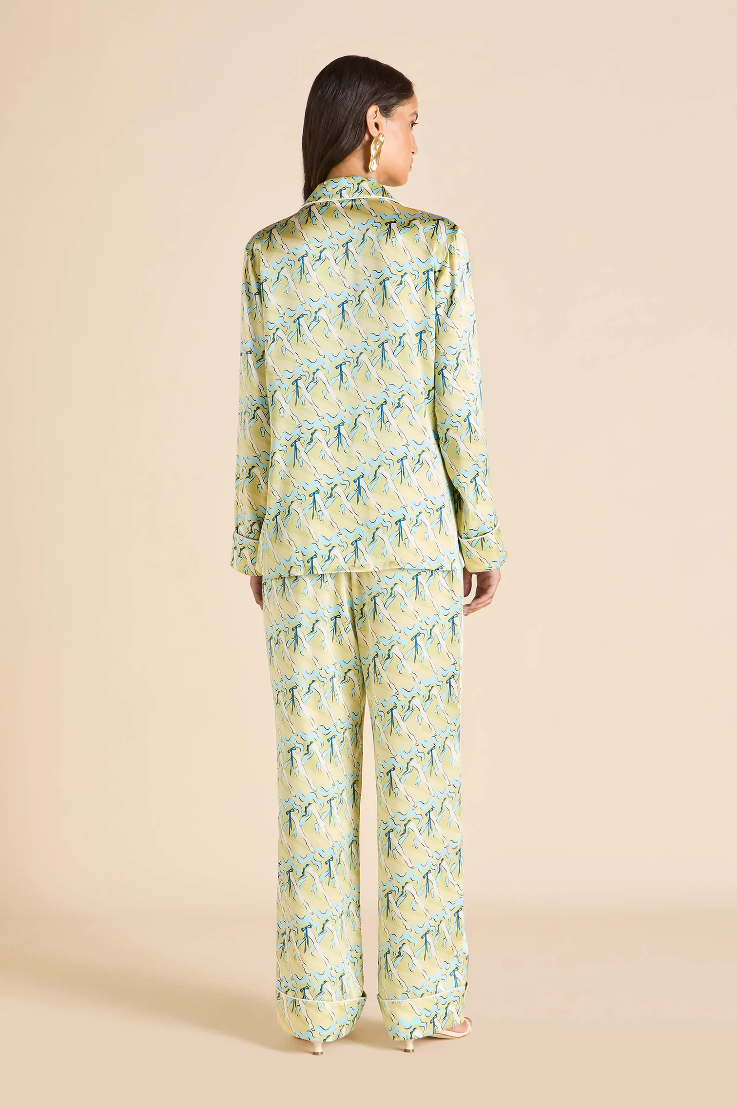 Pale yellow silk satin, soft and luminous, patterned with can-can sketches that evoke evenings in Paris. The Lila Loulou pajama drapes with an easy, relaxed fit, made for cozy evenings at home or welcoming friends in something beautiful.