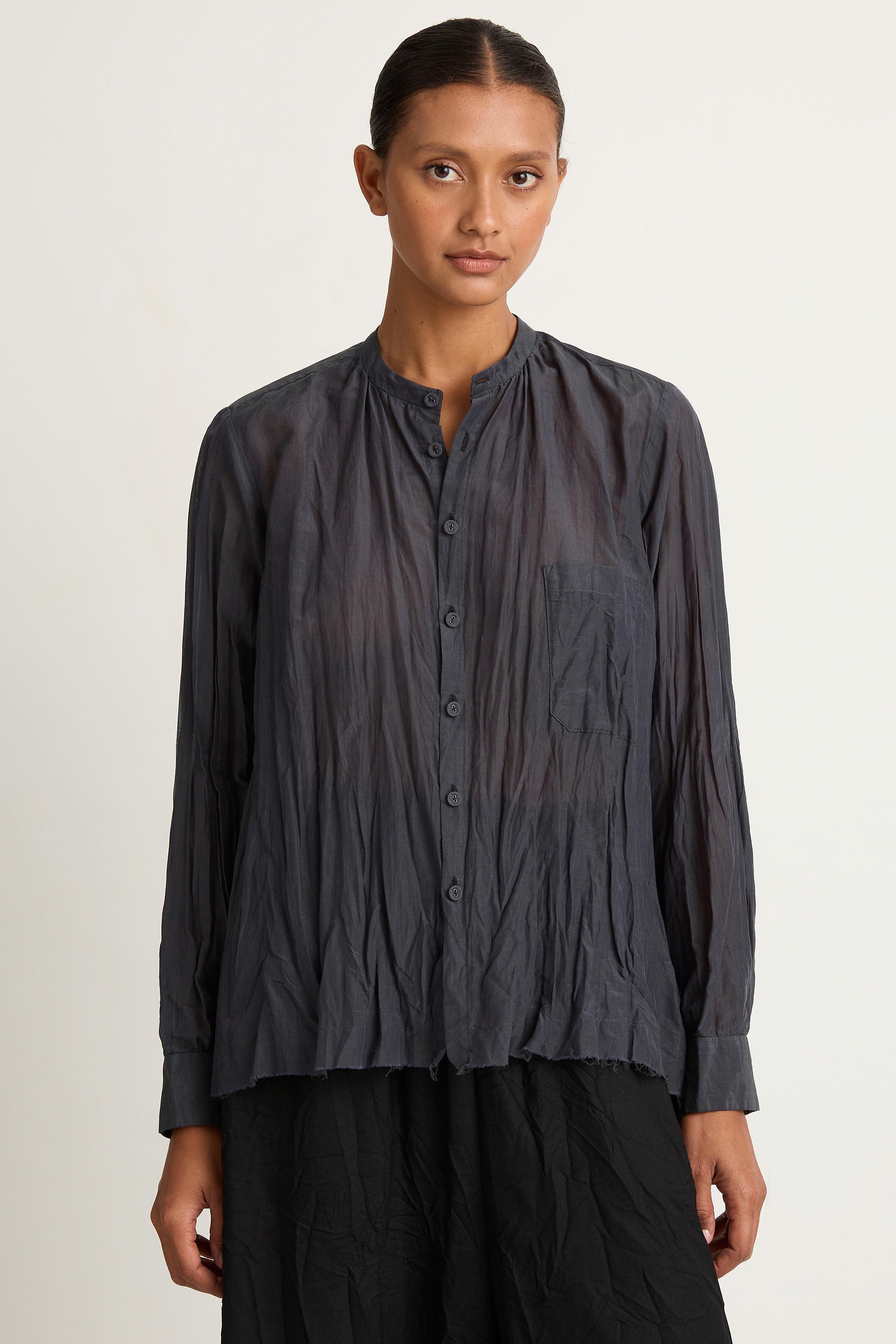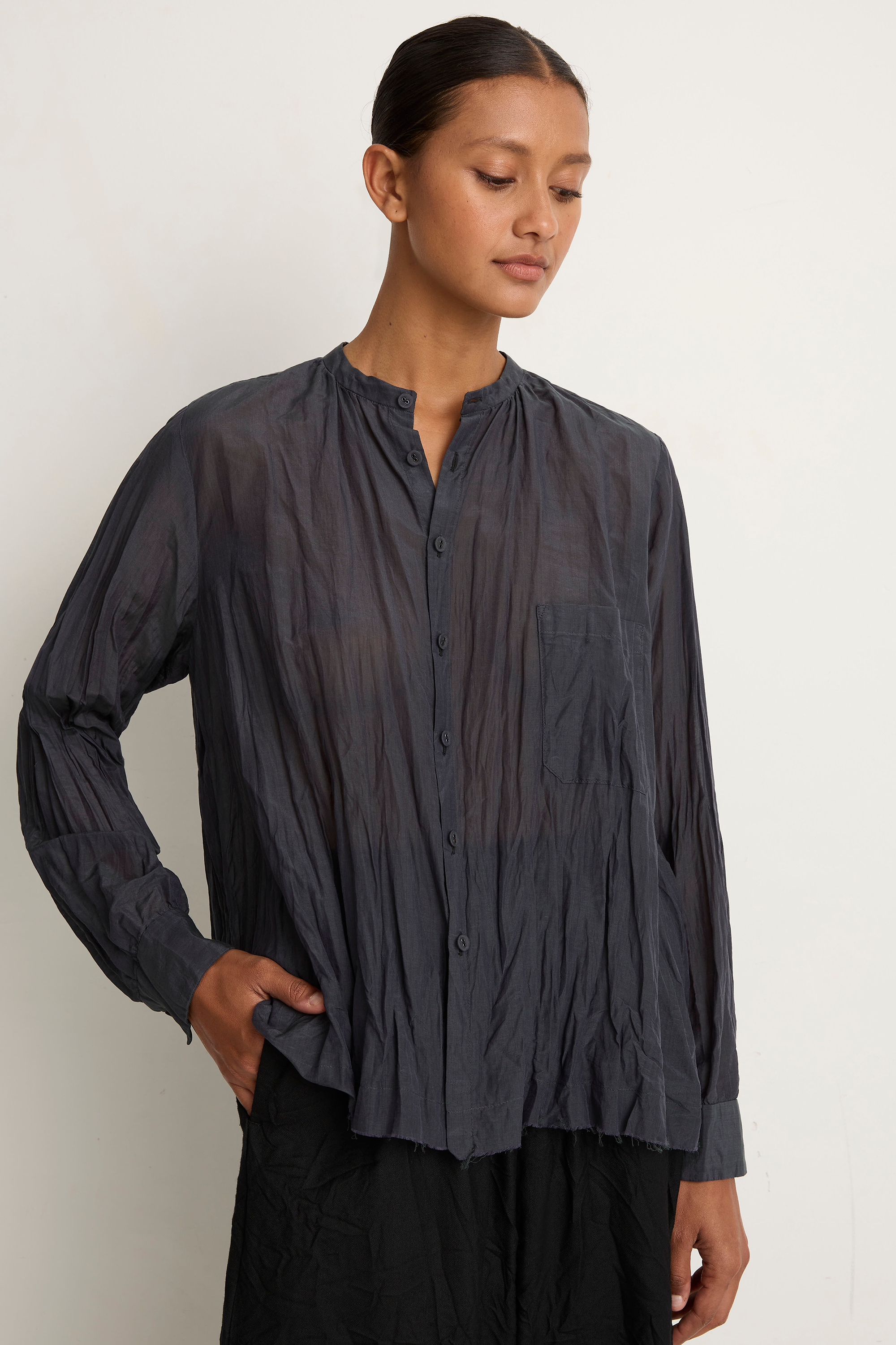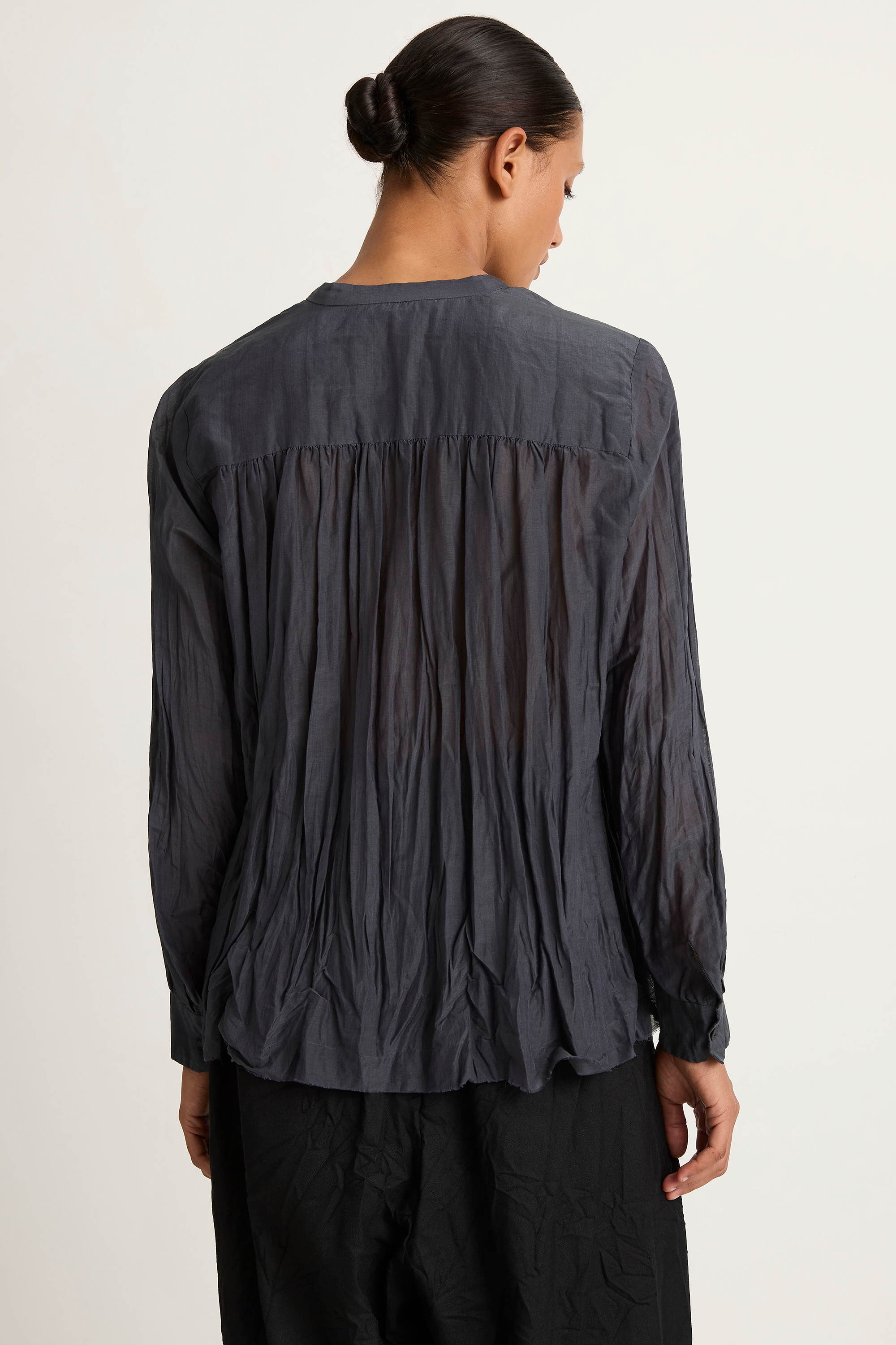 Style: Botanical dye stand collar blouse. Featuring gathers below the back yoke and along the front neckline, the cutoff detail at the hemline.