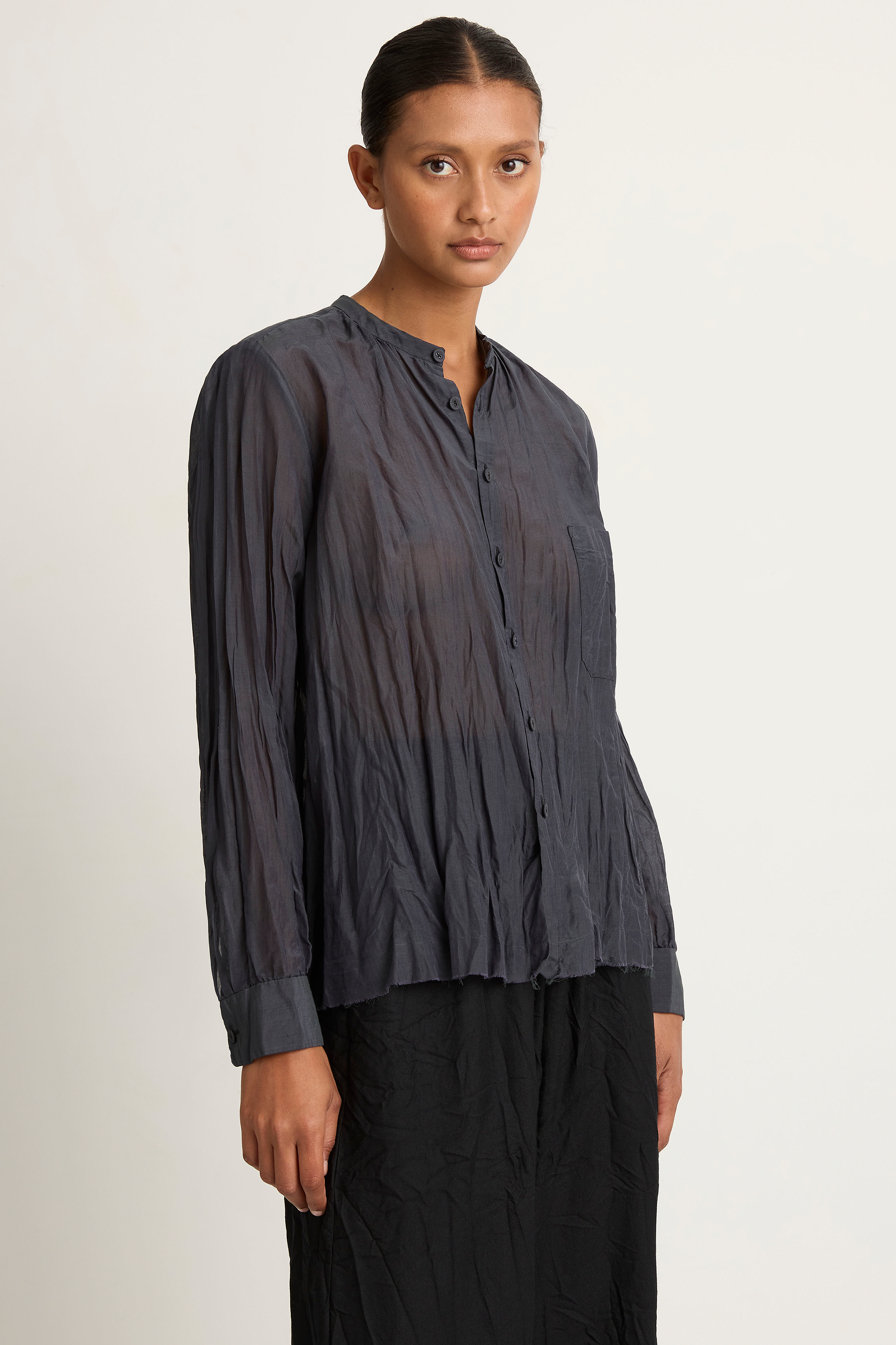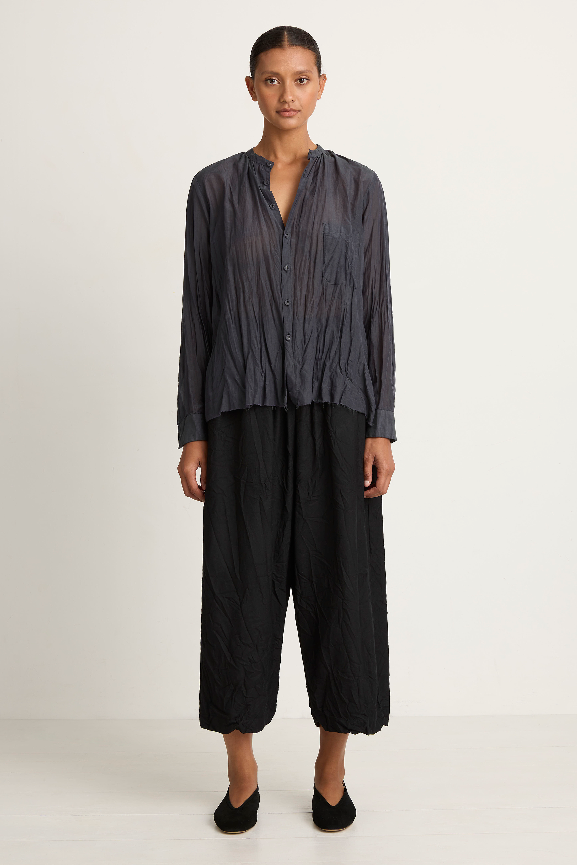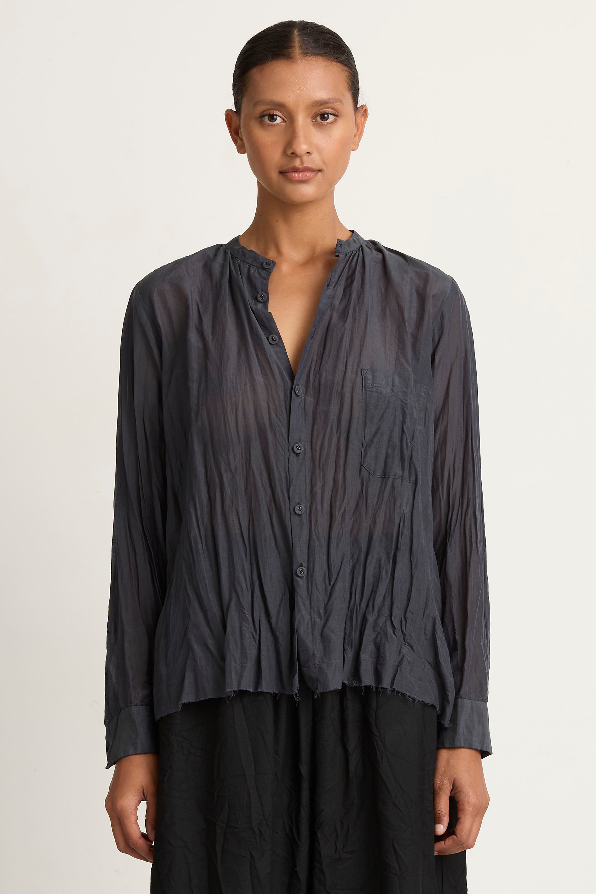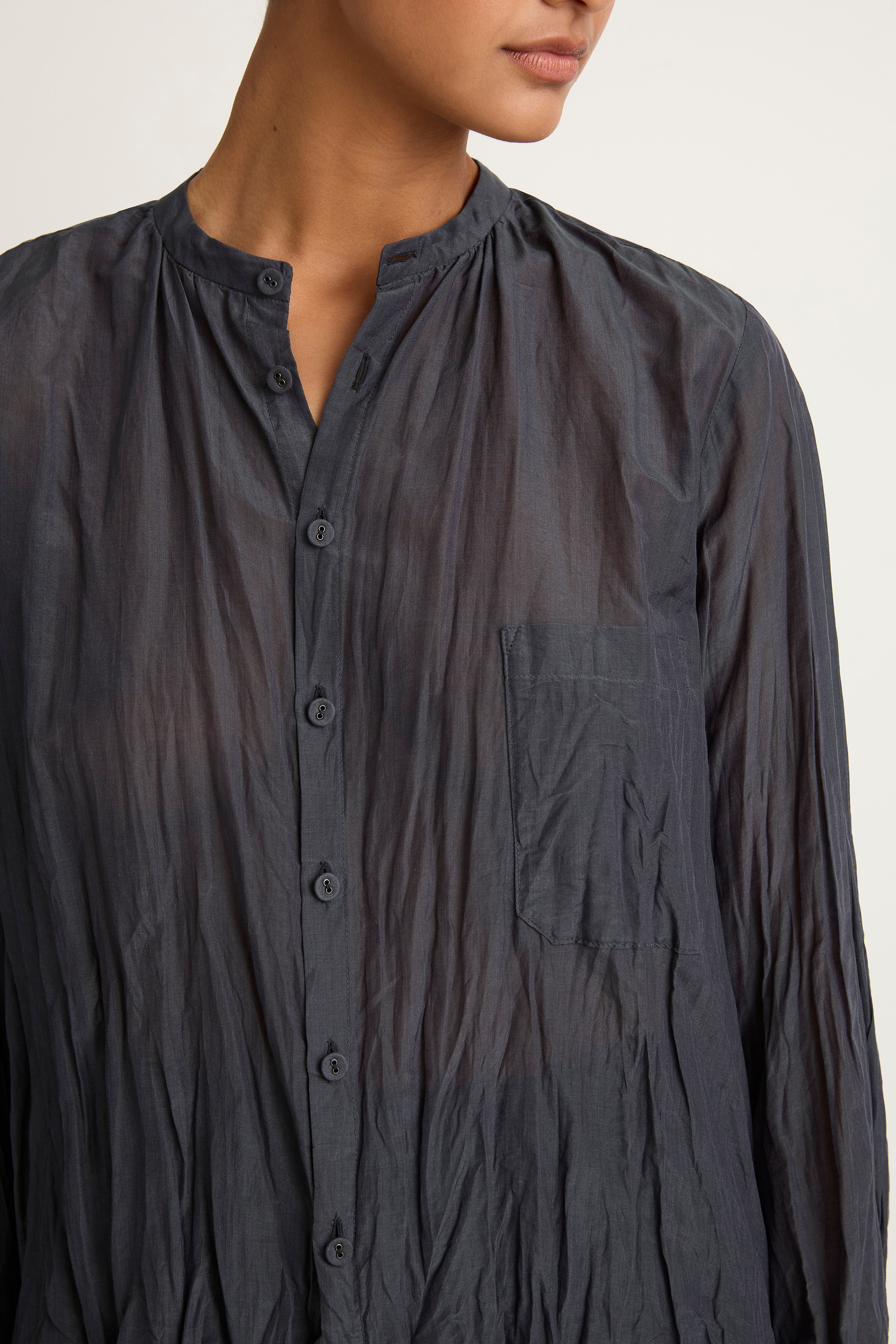 Style: Botanical dye stand collar blouse. Featuring gathers below the back yoke and along the front neckline, the cutoff detail at the hemline.