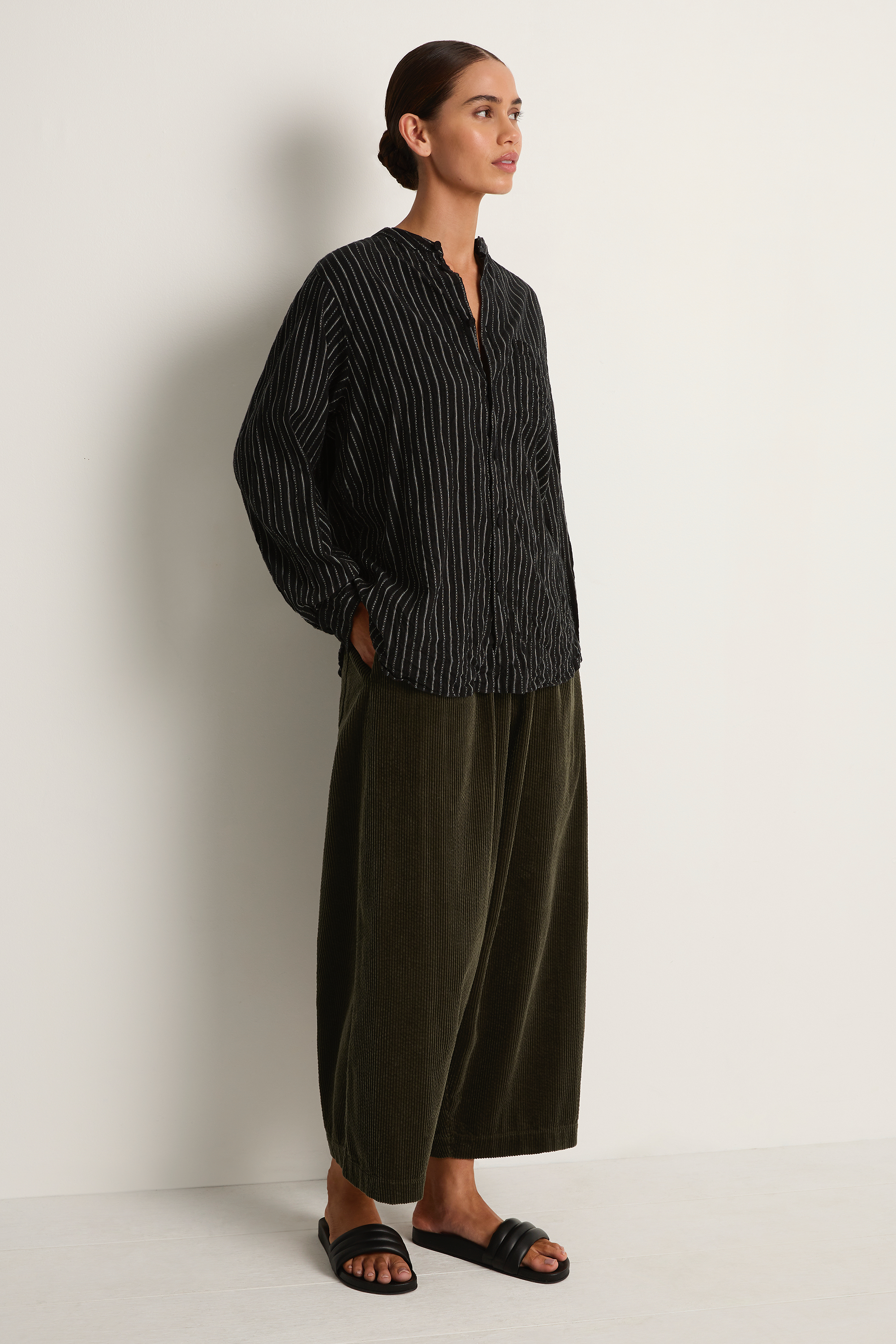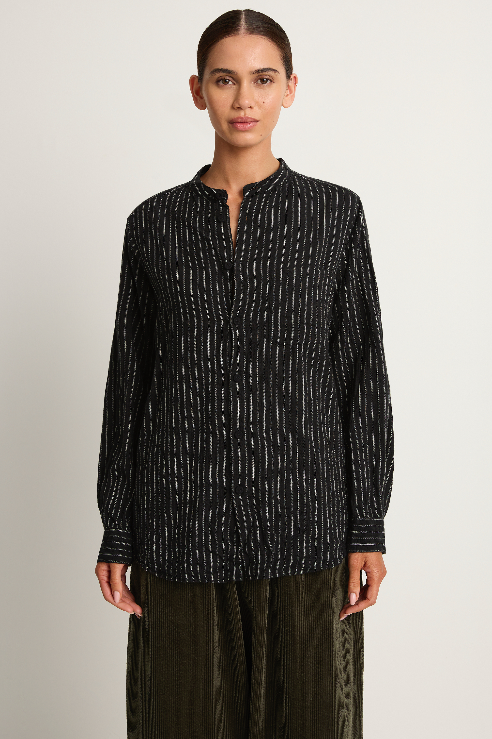 Brushed Doby Stripe Blouse, soft against the skin, cut with ease. A stand collar and button front keep it simple, finished in black with fine stripes. Cozy, understated