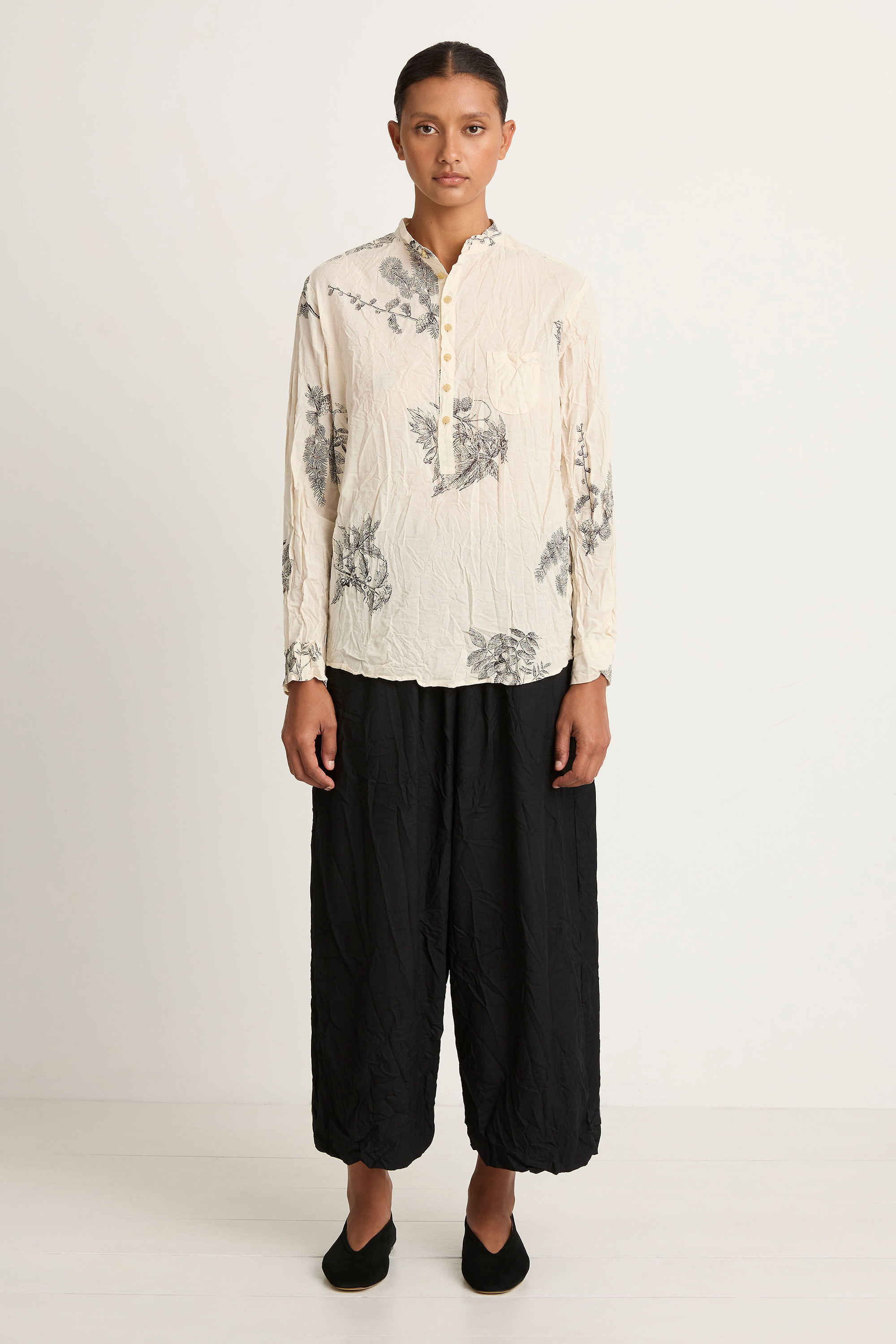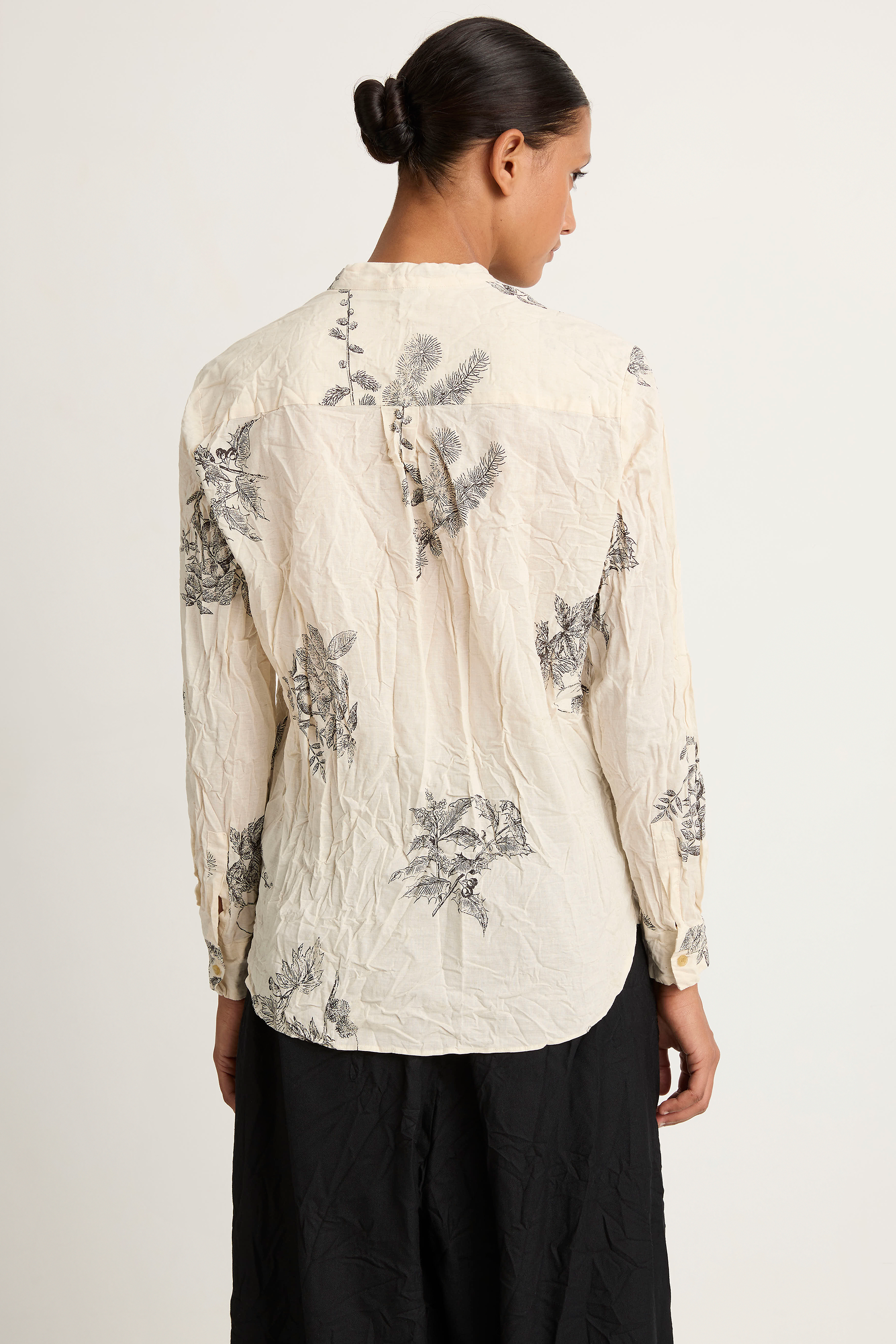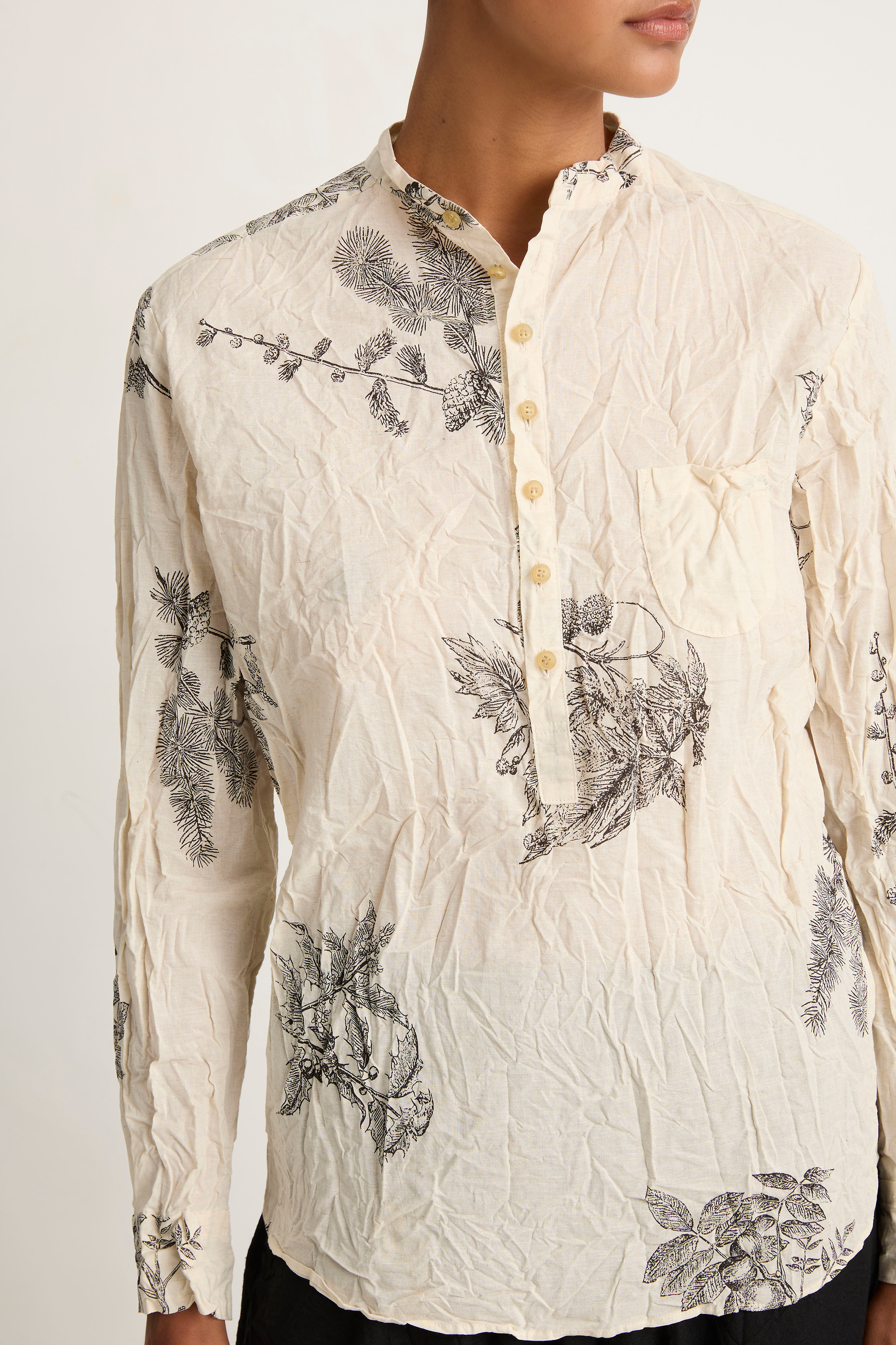 Fabric: Print named "Friends of the forest". The cotton linen voile has a soft feel on the skin and good bounce and is printed in Kyoto. 65: Natural: plant motifs are overprinted after dyeing the base, 44: Khaki: delicate motif patterns are produced by a pigmented discharge dyeing process. Garment crinkle finished. The crinkles fade with each washing. Please make crinkles by yourself after washing and hang it up. Please enjoy the change over time for a different look.