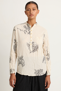 Fabric: Print named "Friends of the forest". The cotton linen voile has a soft feel on the skin and good bounce and is printed in Kyoto. 65: Natural: plant motifs are overprinted after dyeing the base, 44: Khaki: delicate motif patterns are produced by a pigmented discharge dyeing process. Garment crinkle finished. The crinkles fade with each washing. Please make crinkles by yourself after washing and hang it up. Please enjoy the change over time for a different look.