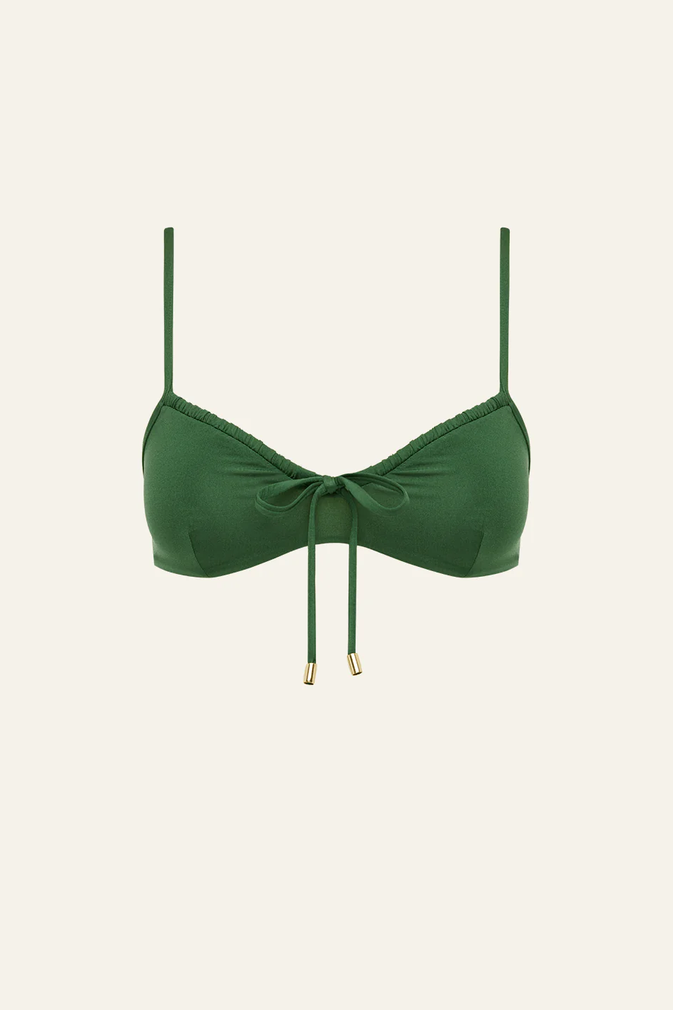 A softly ruched crop top with a clean, minimal silhouette, designed for sun-filled days. The adjustable center front ties allow for customizable coverage, while delicate straps and a multi-option back closure create a secure, personalized fit.