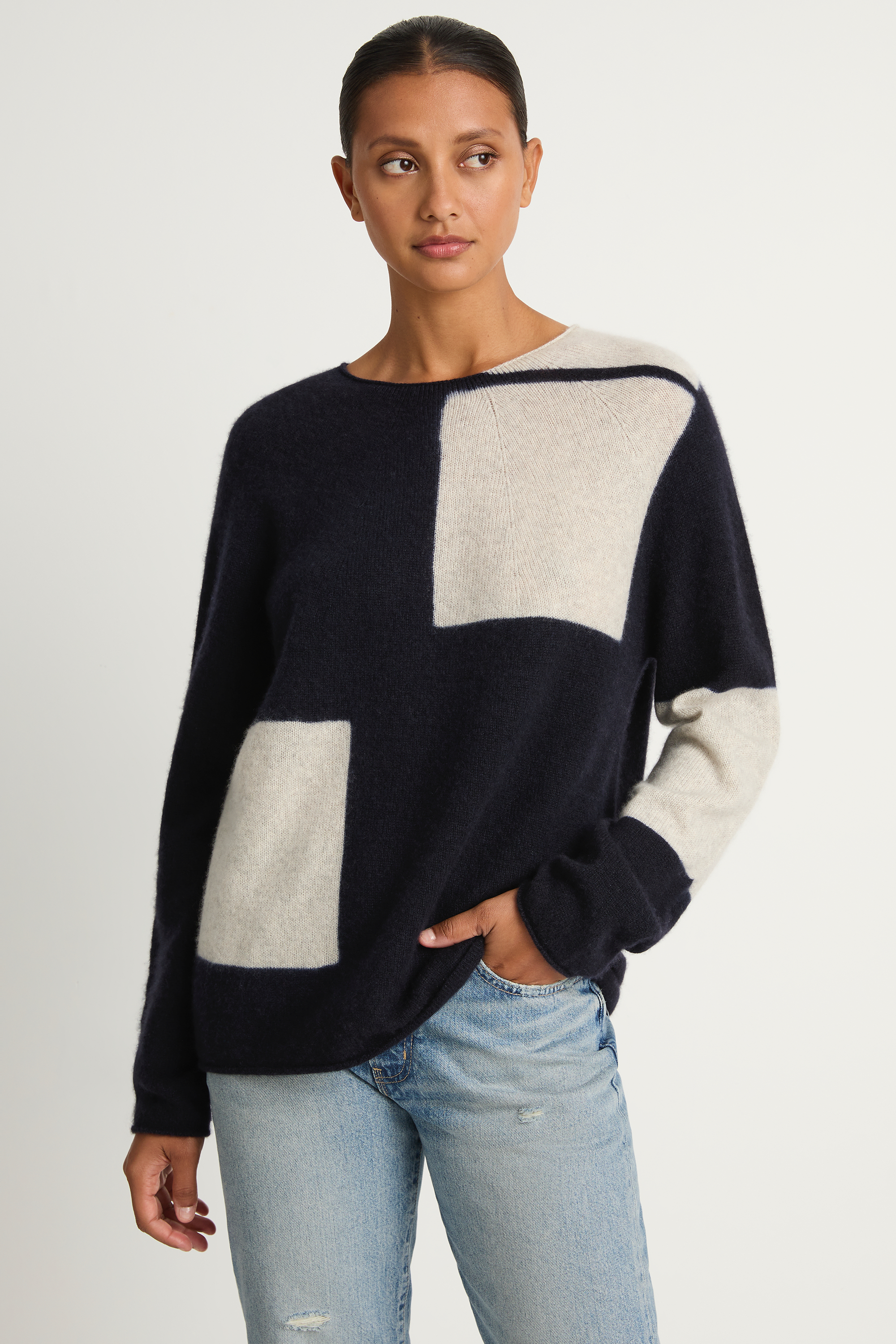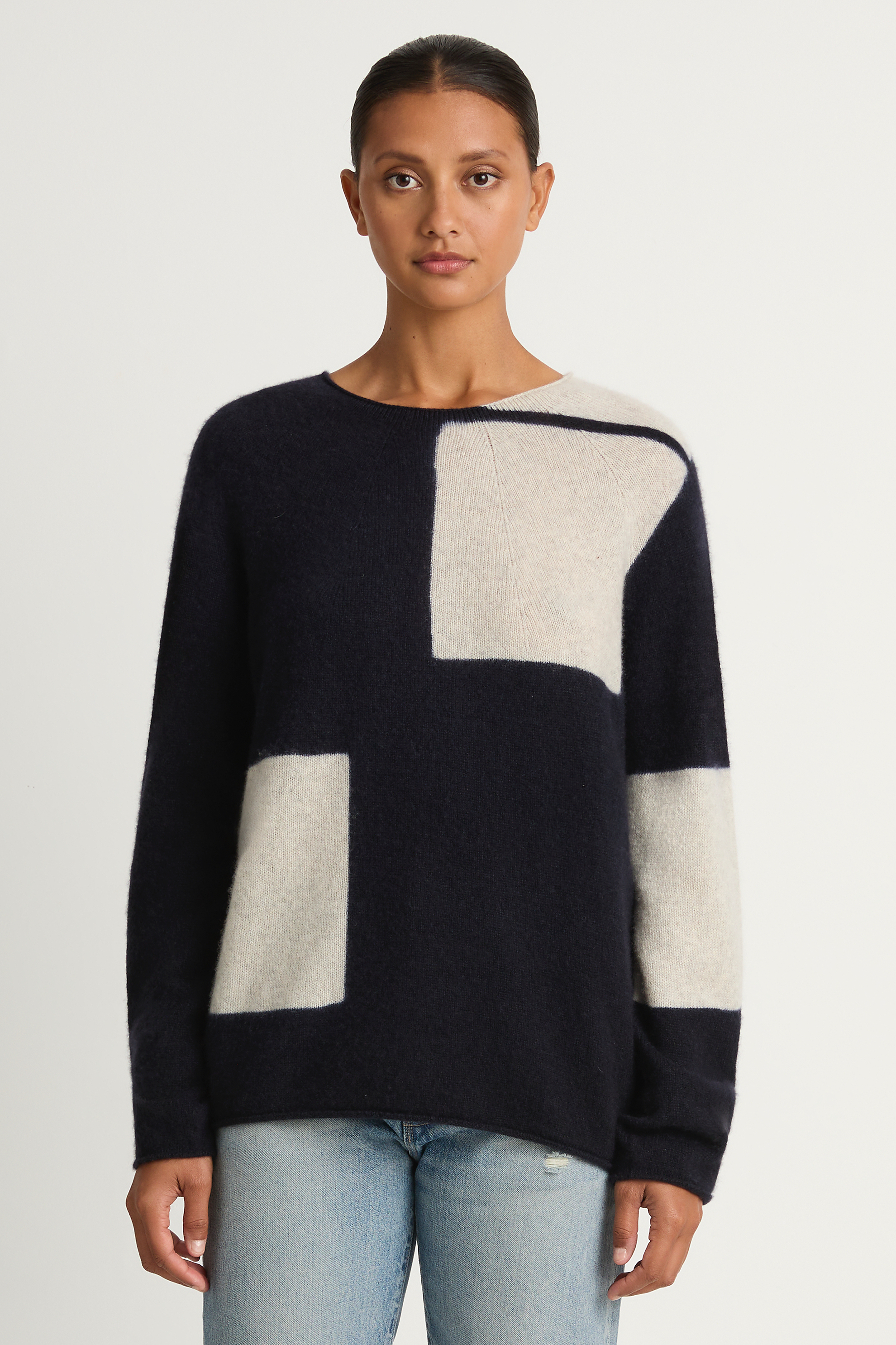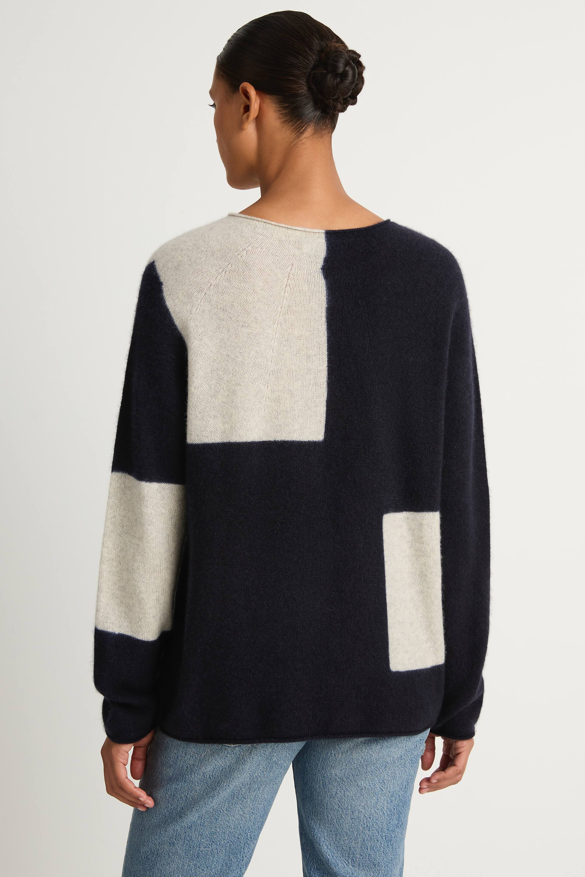 Crafted and hand-dyed in Japan using traditional Arimatsu Narumi Shibori technique, this cashmere crew neck features a boxy fit and long sleeves. Seamless design. Slight variations are a natural result of the intensive handmade process. Suzusan offers a short and long version of this sweater. This is the longer length.