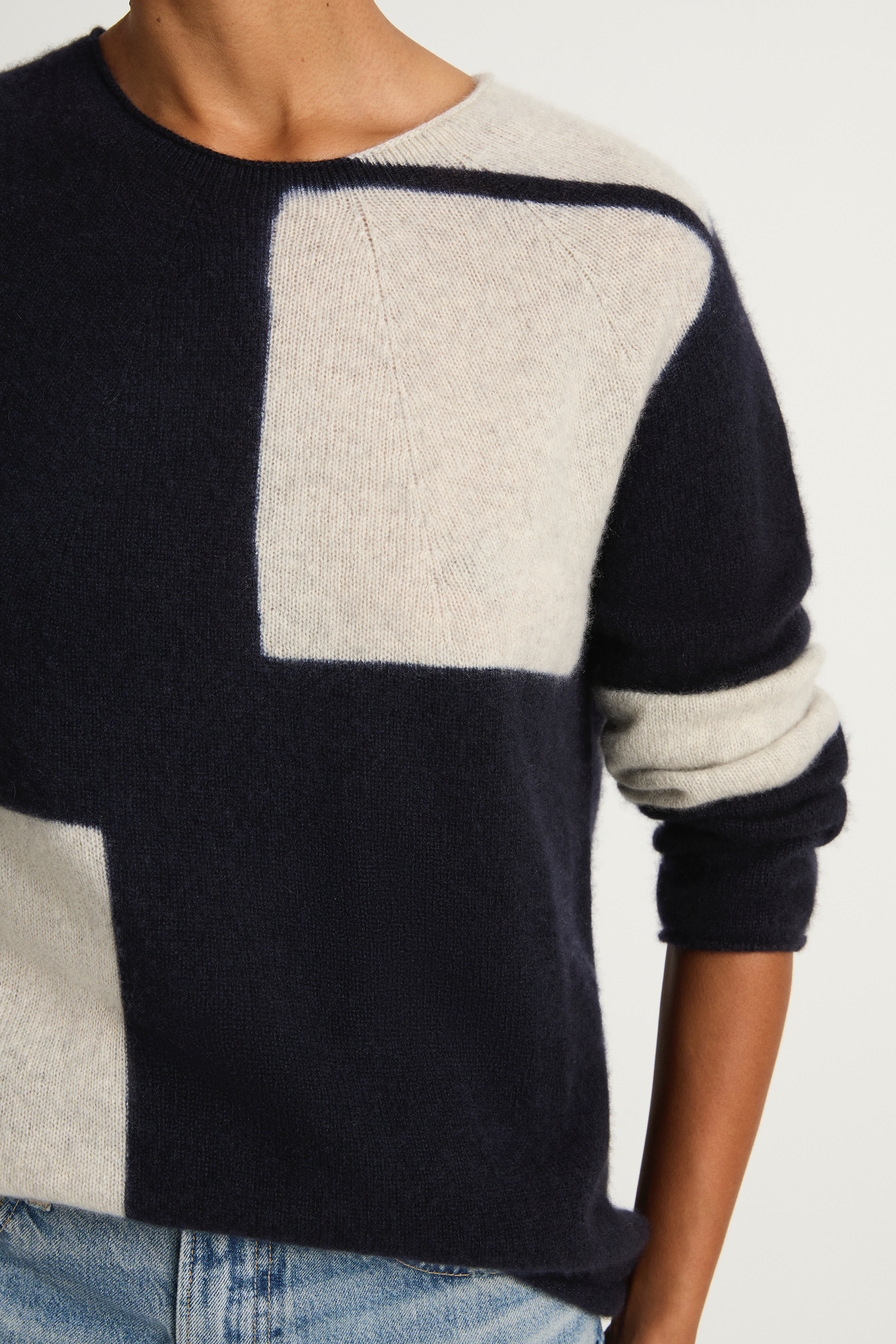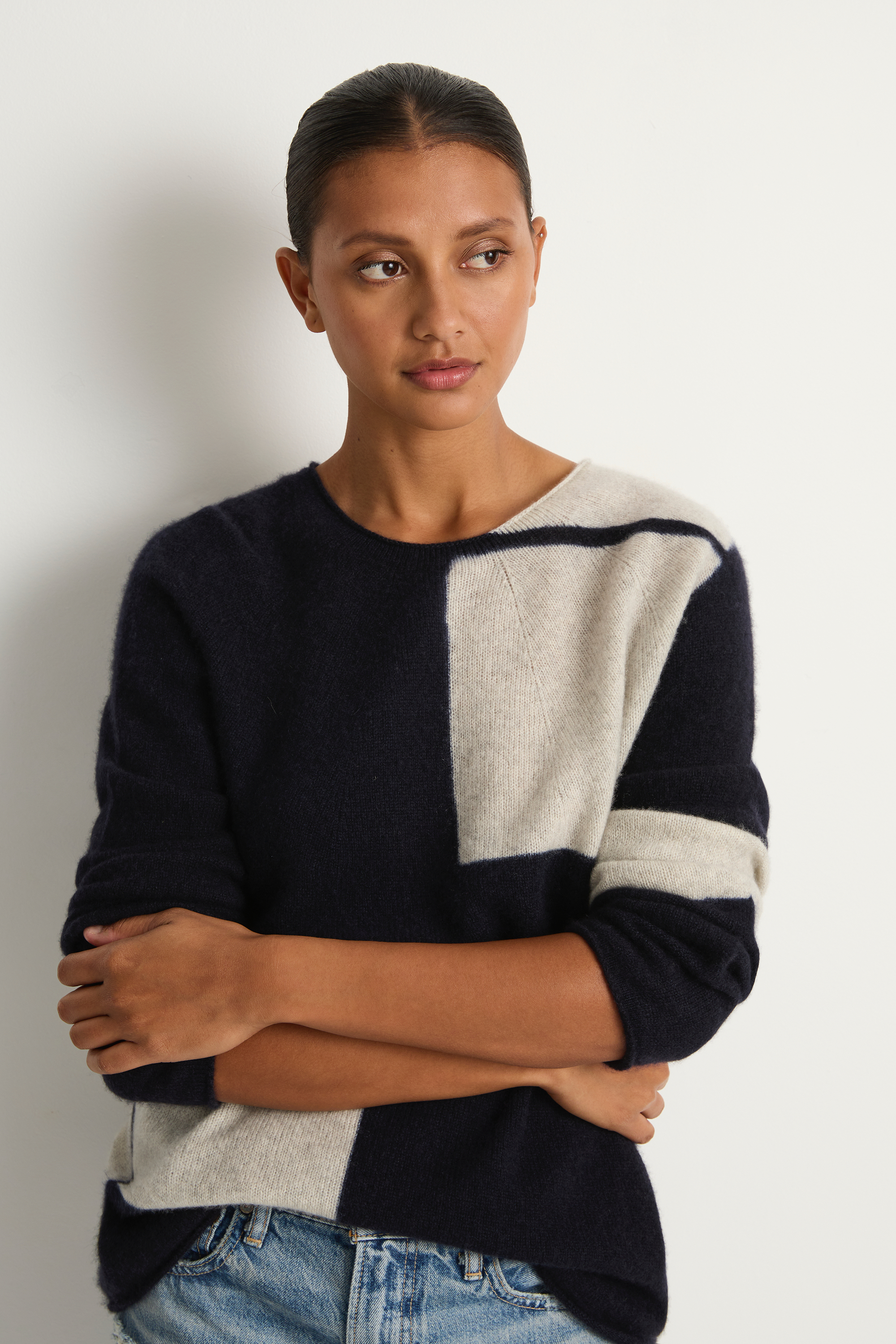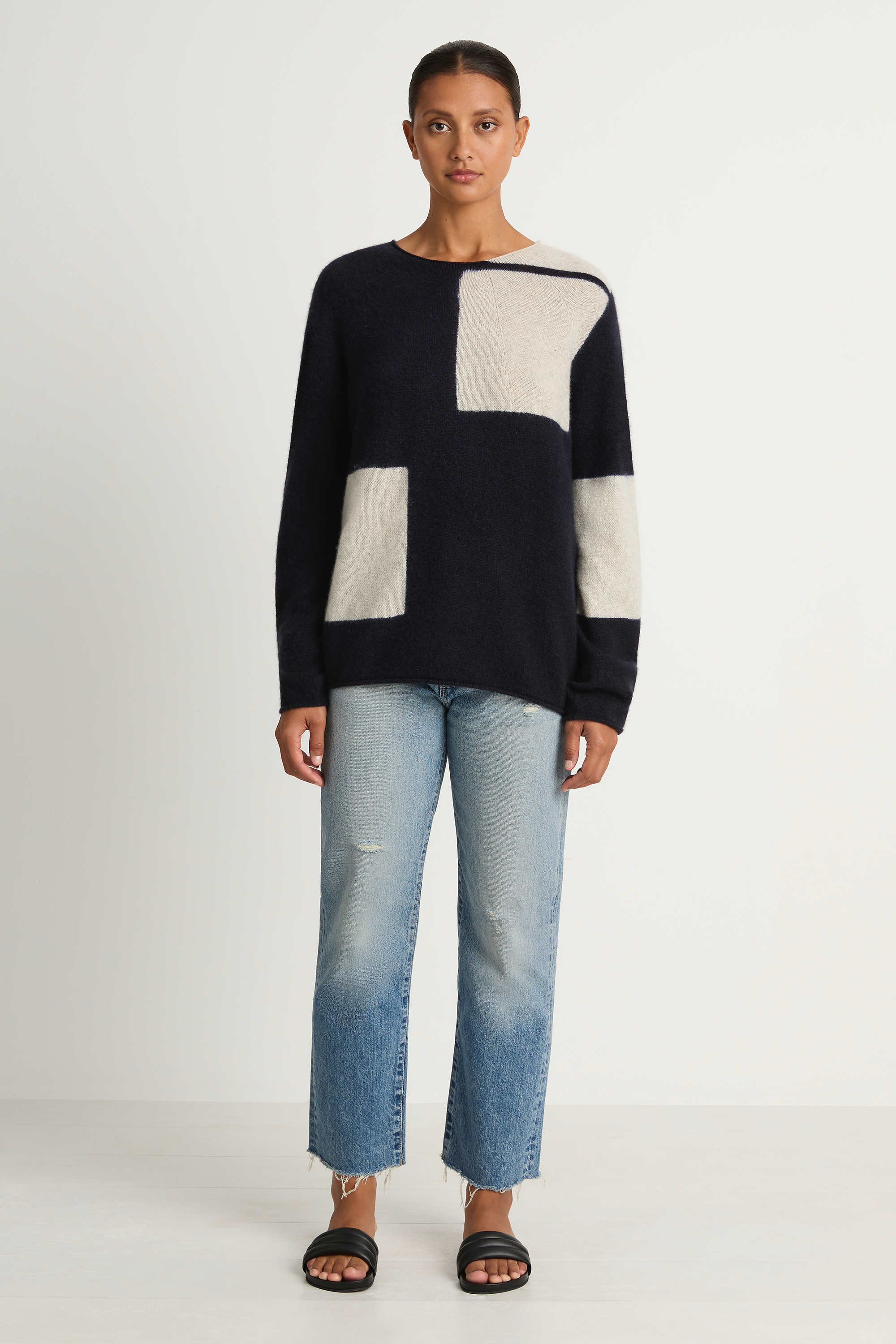 Crafted and hand-dyed in Japan using traditional Arimatsu Narumi Shibori technique, this cashmere crew neck features a boxy fit and long sleeves. Seamless design. Slight variations are a natural result of the intensive handmade process. Suzusan offers a short and long version of this sweater. This is the longer length.