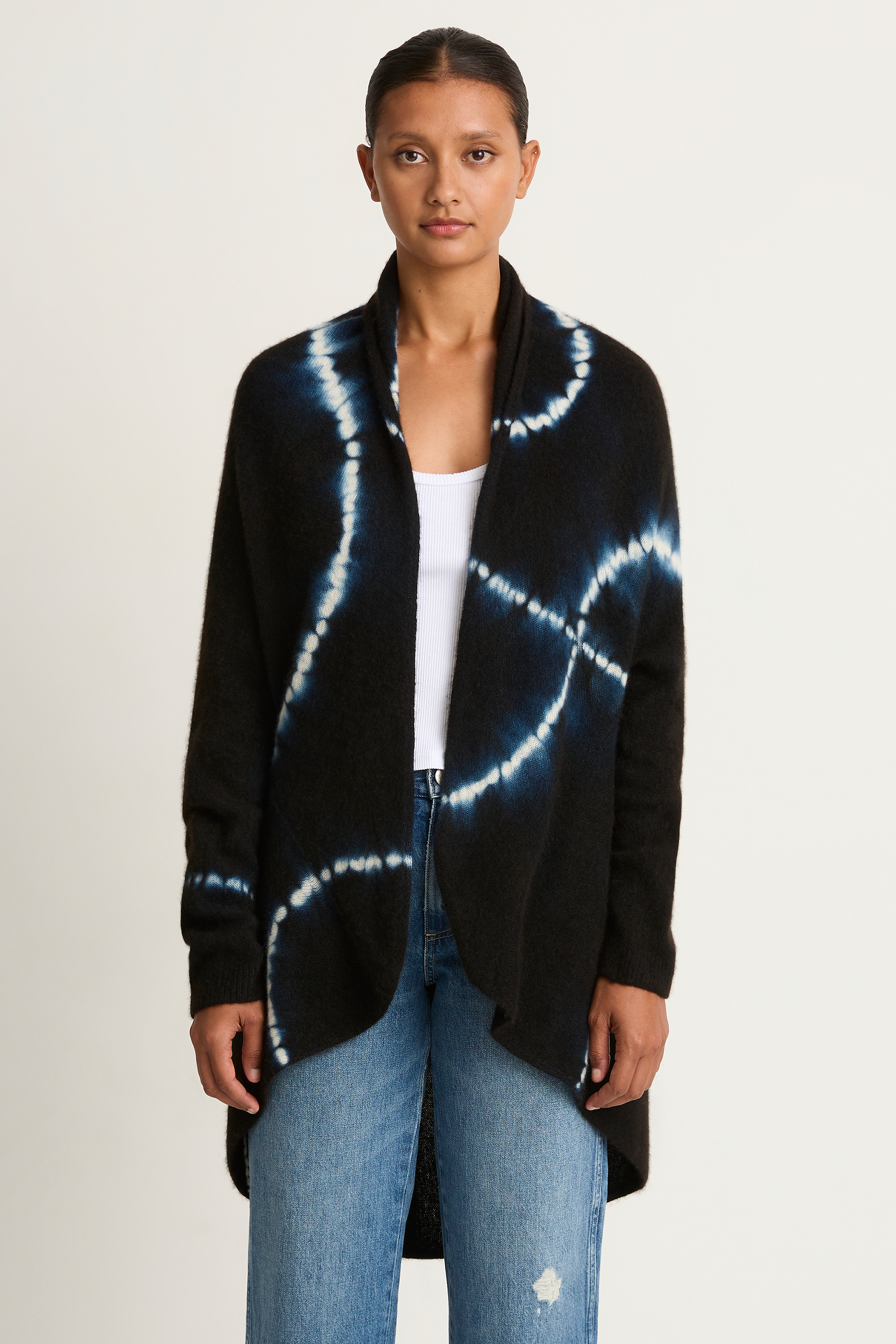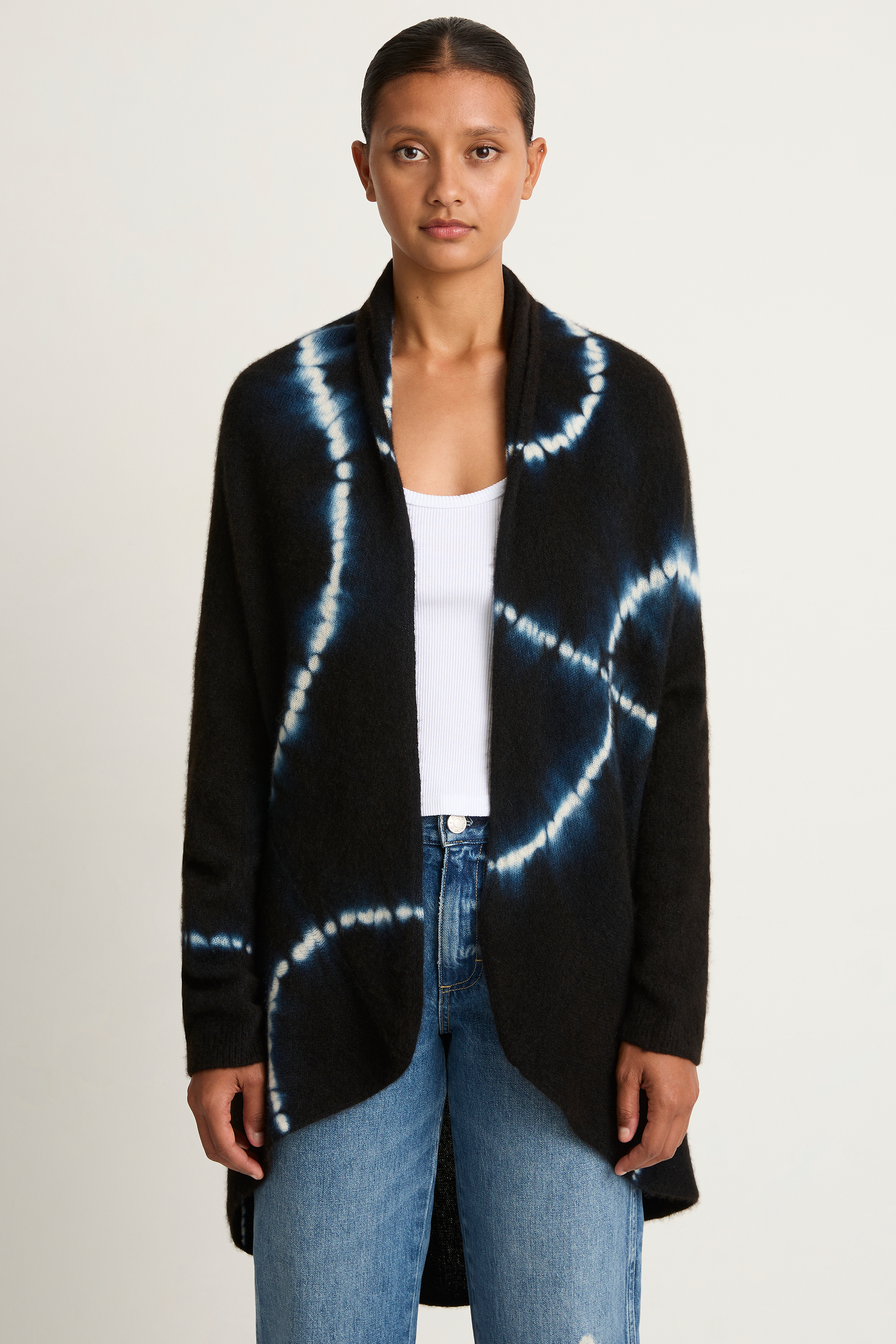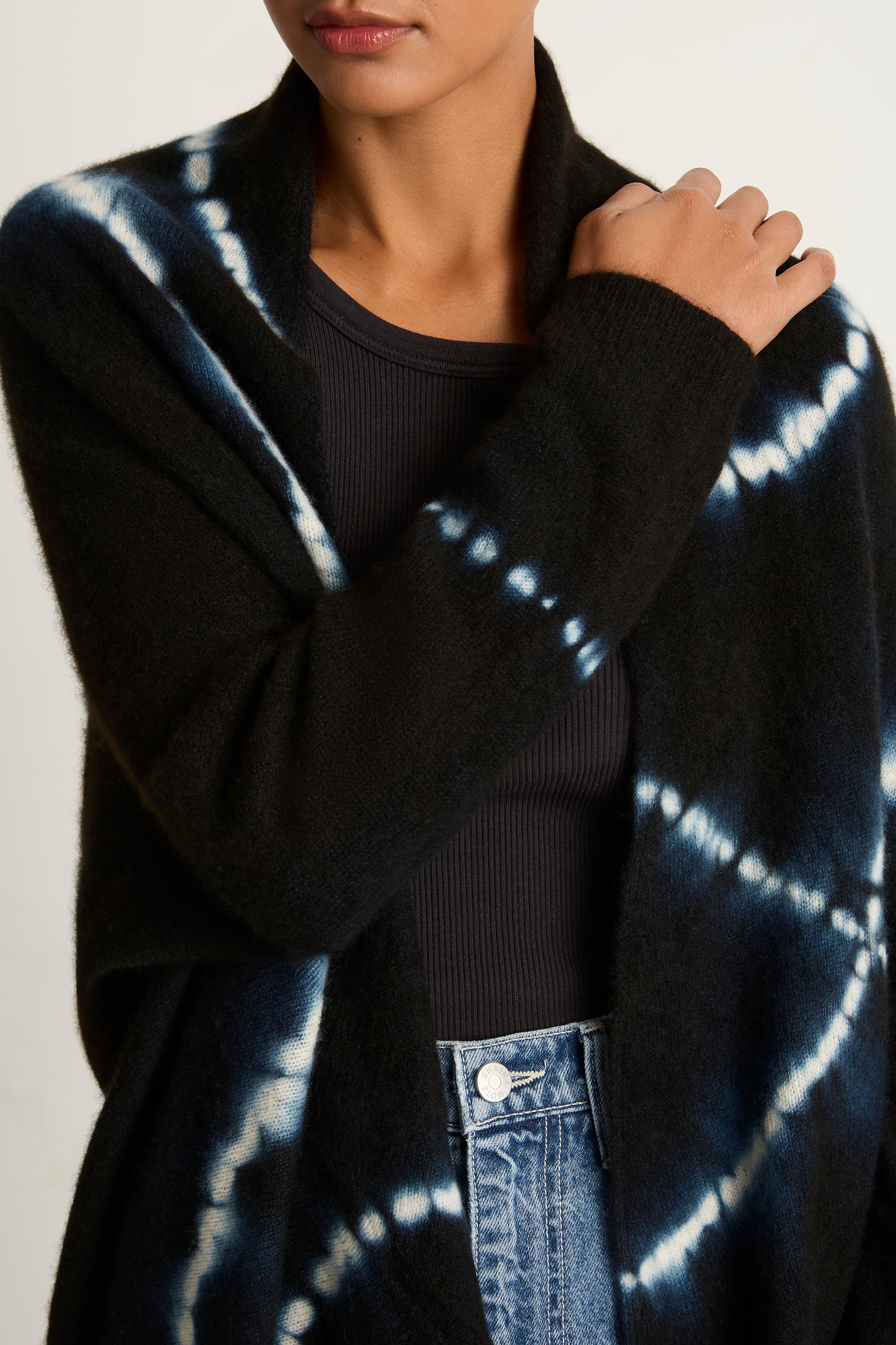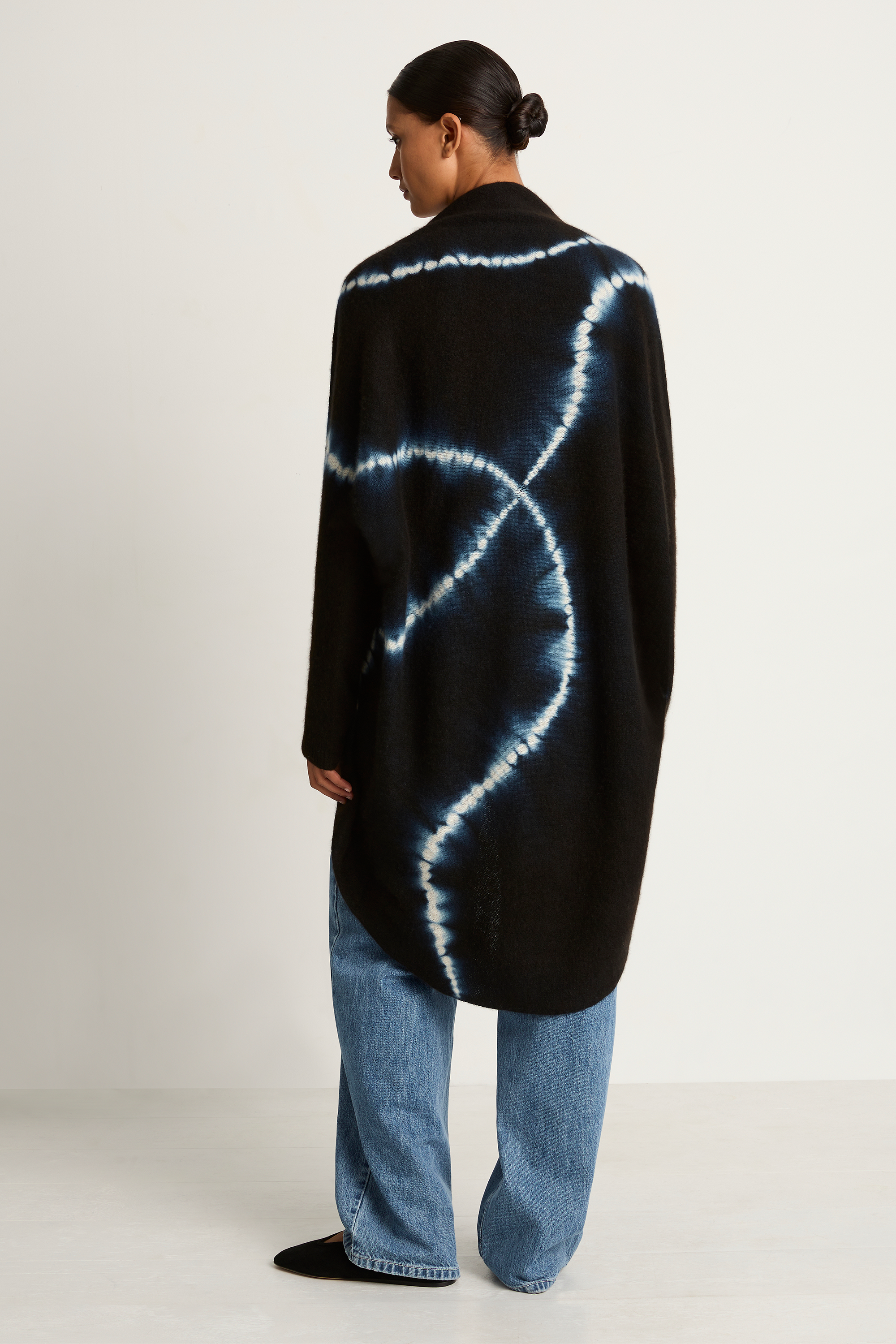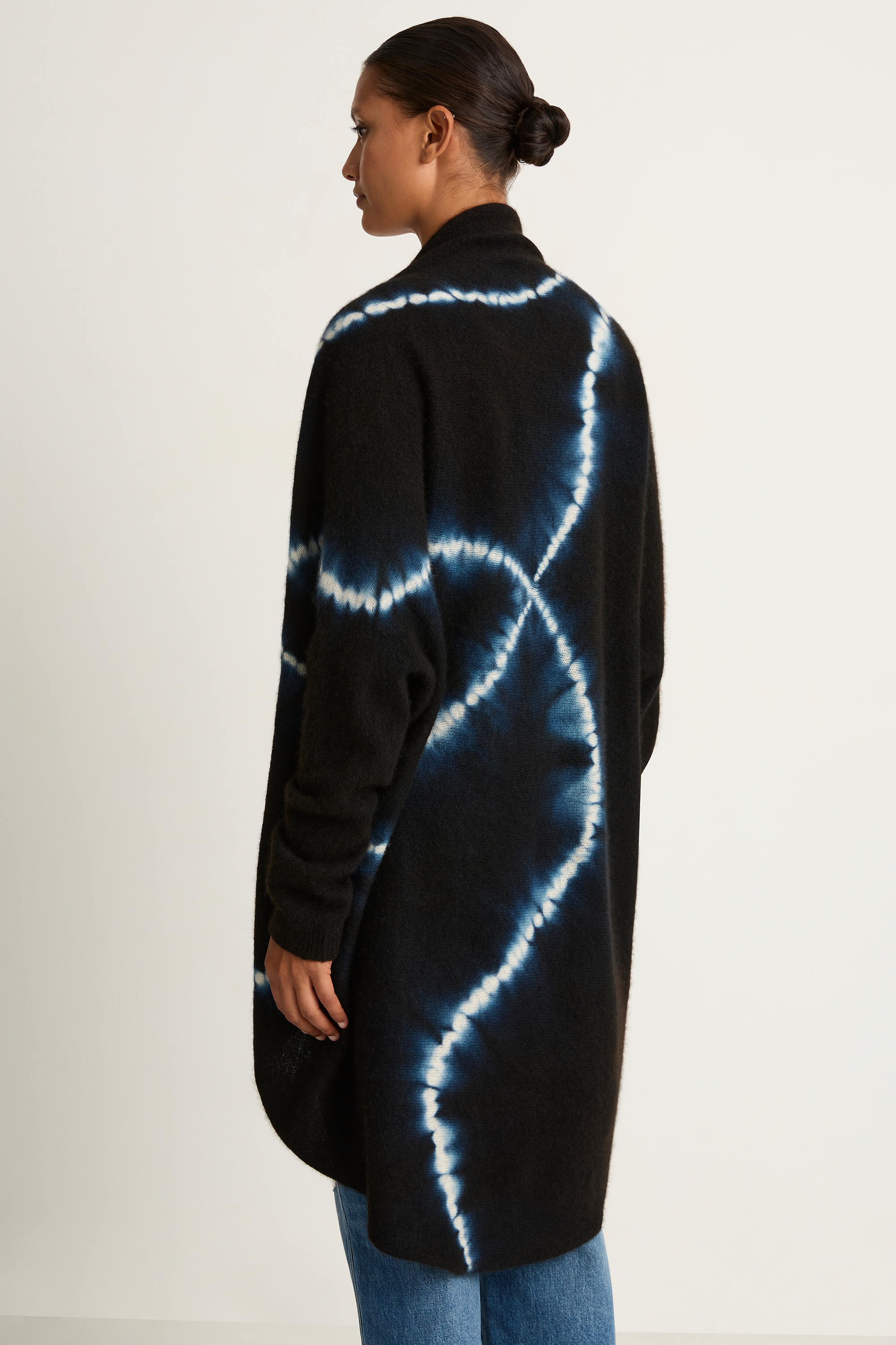 Oversized long sleeve cashmere cardigan crafted and hand-dyed in Japan using traditional Arimatsu Narumi Shibori techniques. Wear it long or short by flipping upside down.