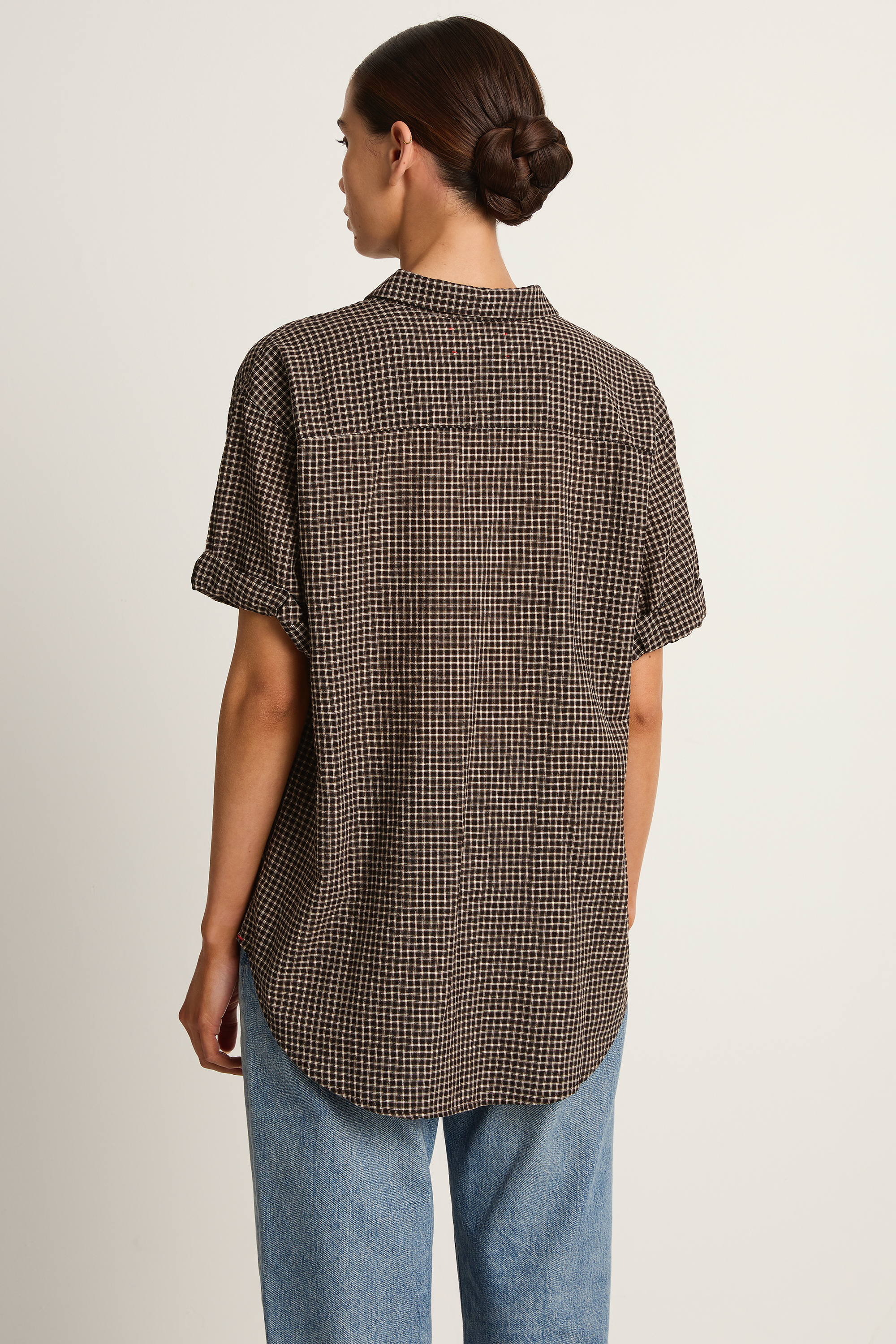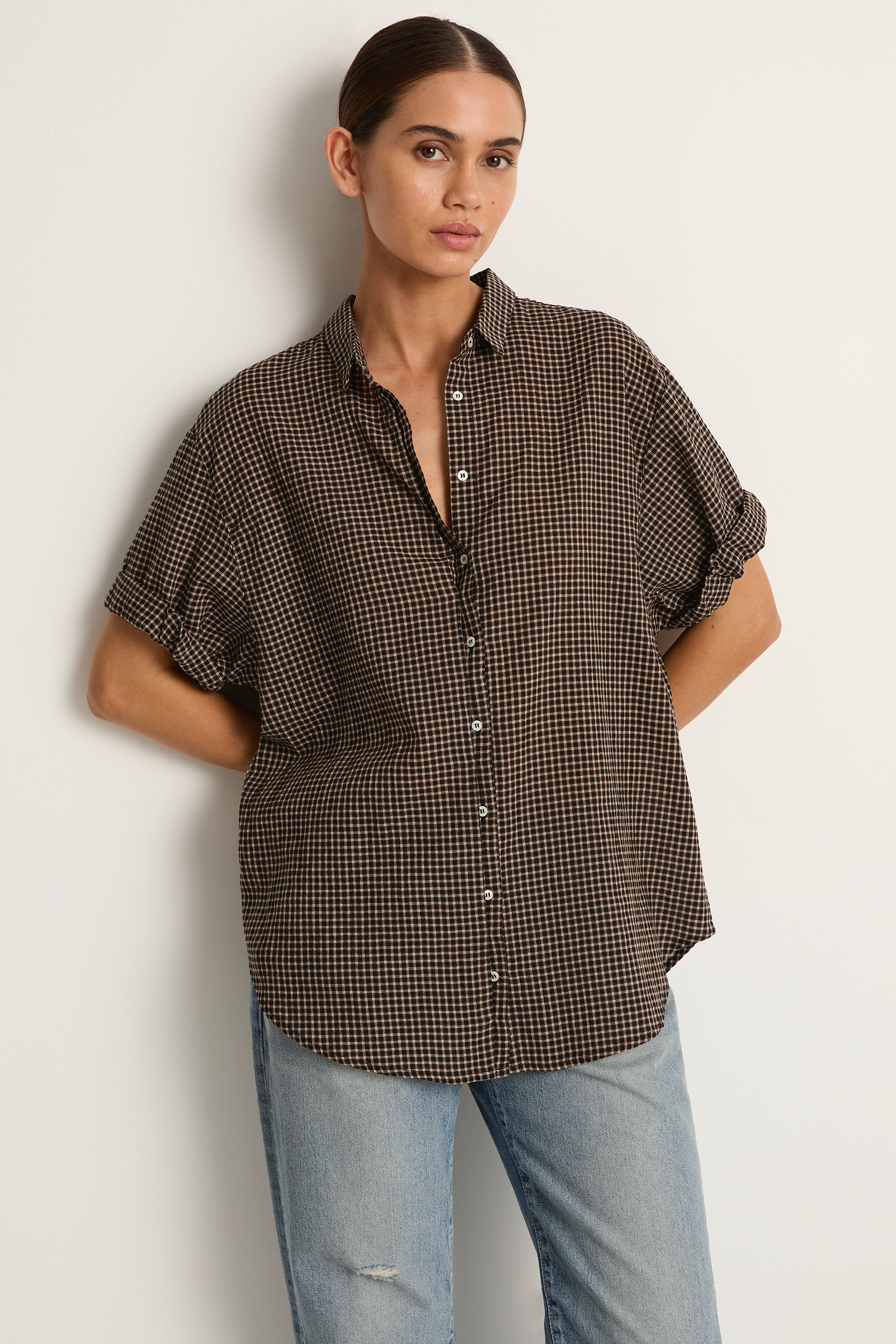 An elevated essential with a borrowed-from-him silhouette. Crafted from Xirena's Farren Mini Check fabric, this best-selling shirt features rolled short sleeves, a full button front, and an oversized fit — tailored yet relaxed.