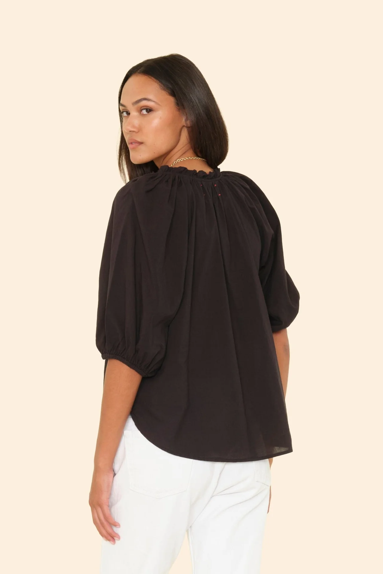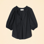 A Xirena staple, the Jules Top is crafted from lightweight woven cotton poplin with an effortless, lived-in feel. Designed as an easy popover, it features a soft ruffle neckline and airy bubble sleeves finished with elastic cuffs for relaxed shape and subtle volume.
